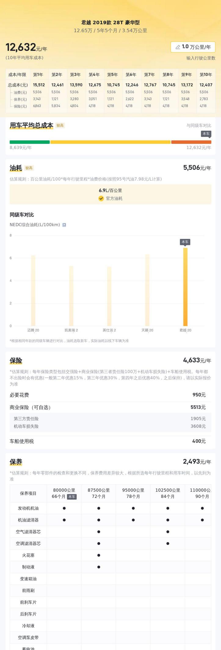 他还提醒我,别克君越的后期保养费用相对较高,毕竟是B级车,配件价格也比较贵。按照每年行驶1万公里计算,一年的综合用车成本大概在1.3万元左右。当然,这只是一个参考值,实际费用可能会根据用车强度和环境等因素有所变动。