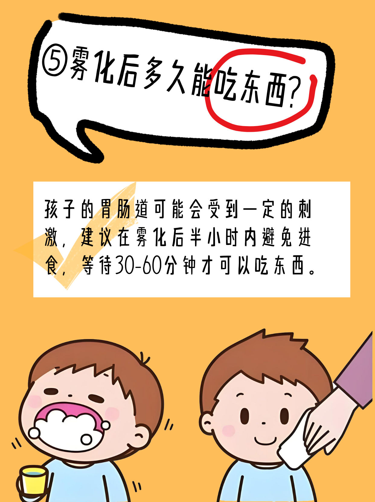 孩子的胃肠道可能会受到一定的刺激,建议在雾化后半小时内避免进食,等待30-60分钟才可以吃东西。