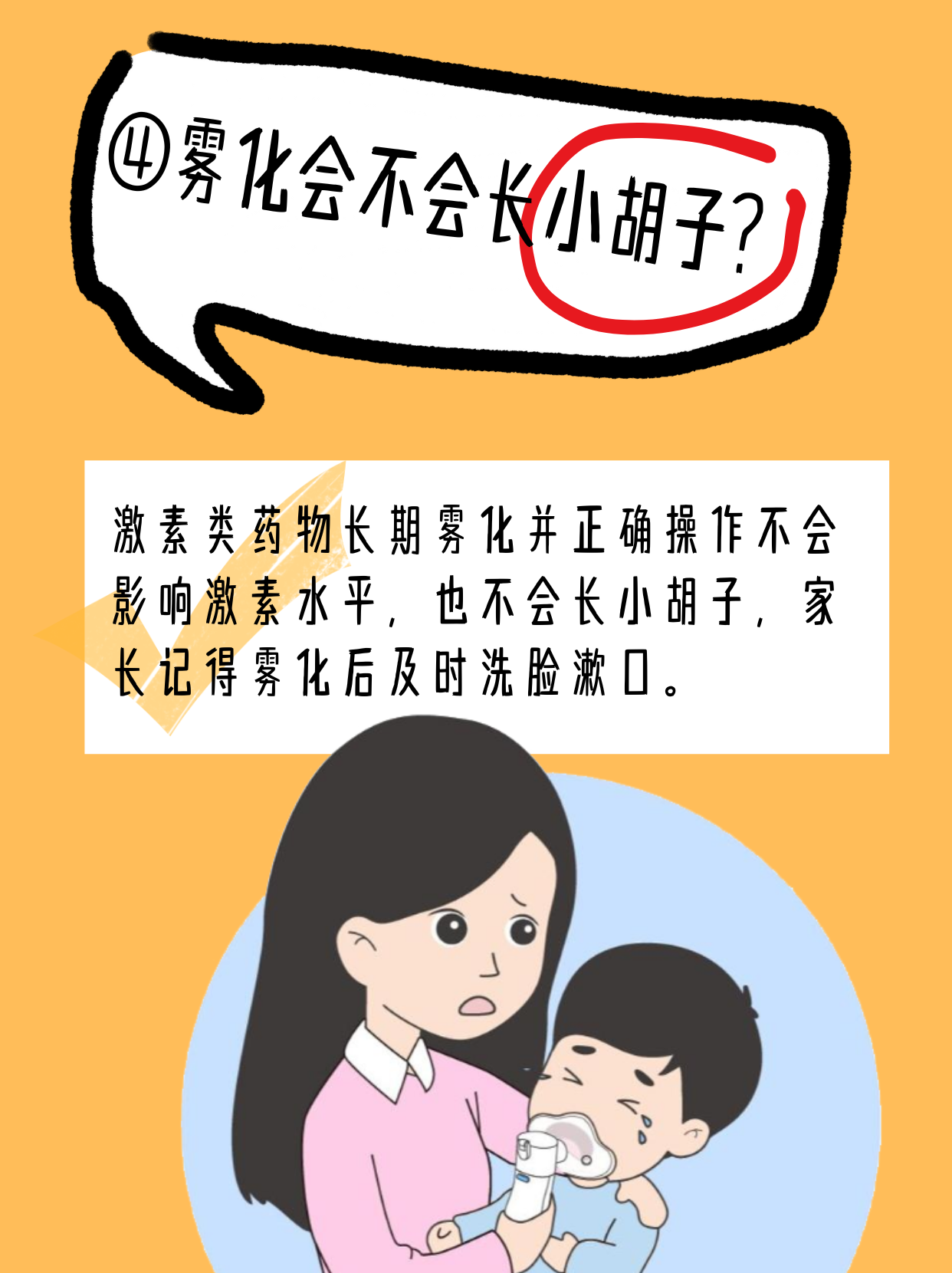 激素类药物长期雾化并正确操作不会影响激素水平,也不会长小胡子,家长记得雾化后及时洗脸漱口。