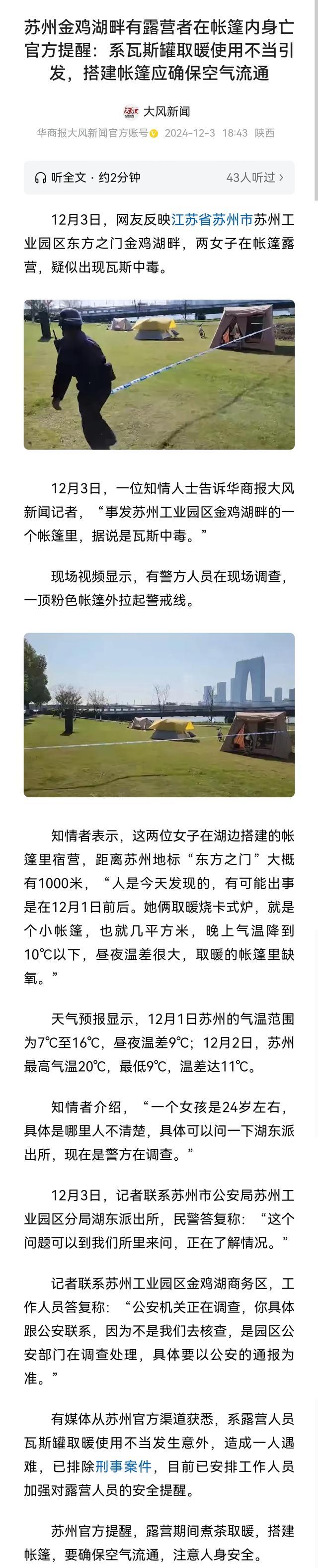 12月3日,据大风新闻等多家媒体报道,苏州工业园区东方之门金鸡湖畔,两女子在帐篷露营疑似用卡式炉取暖出现瓦斯中毒,其中一名女子被发现死亡。