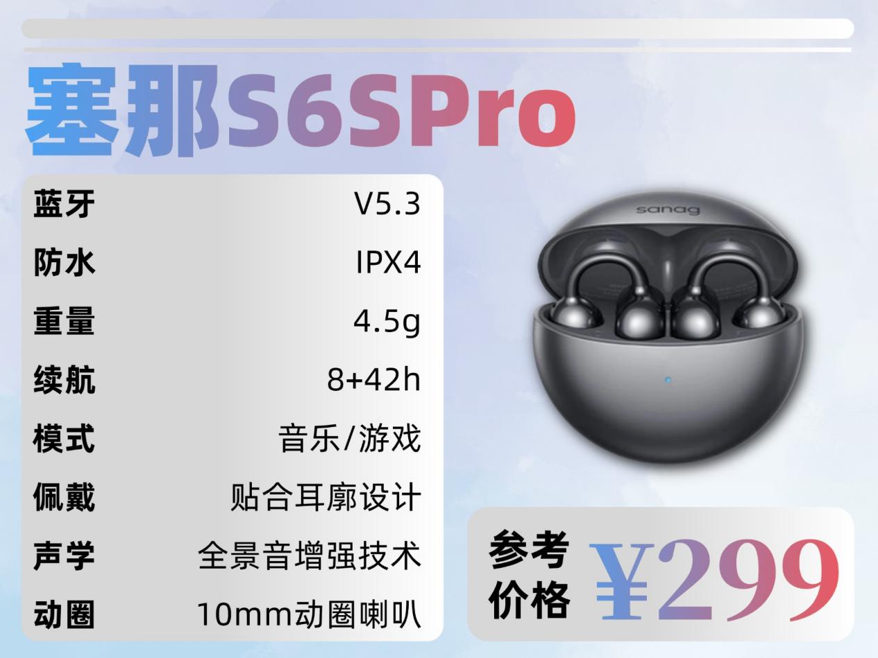 塞那S6SPro:这款耳机单耳仅 4g,轻量化设计搭配 0.6mm 记忆柔丝与人体工学结构,能精准适配各类耳型,还能均匀分散耳部压力。耳夹处的高弹硅胶包裹带来亲肤触感,实现久戴无勒痕、不夹耳,即便运动佩戴也能牢牢固定不脱落。