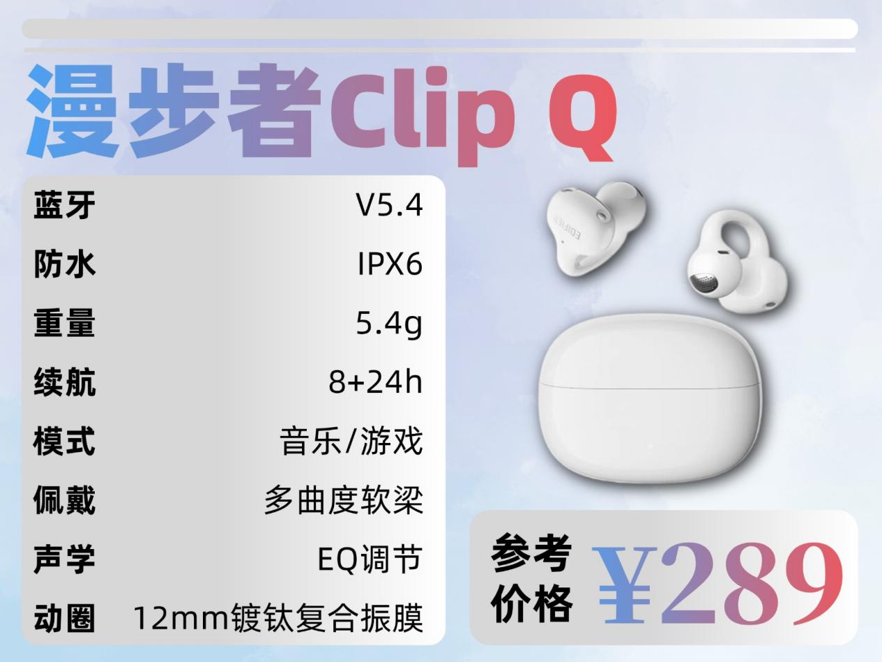 漫步者Comfo Clip Q:这款耳机单耳仅 5.4g,多曲度软梁能紧密贴合耳部轮廓,搭配小巧的圆头造型,可有效缓解耳部压迫感,做到久戴无负担。各类耳型的用户都能轻松适配,即便在运动场景佩戴,也能牢牢固定不易滑落。