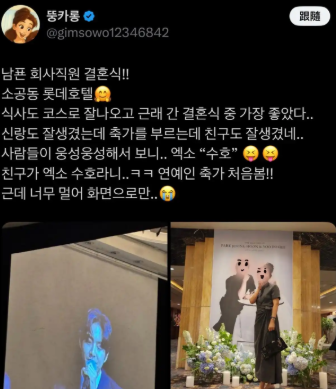 金俊勉献唱传递祝福心意。作为新郎亲弟,金俊勉现场演唱祝歌表达对兄嫂的诚挚心意,真挚演绎引发宾客骚动,有目击者提到宾客因认出EXO的SUHO而激动讨论。