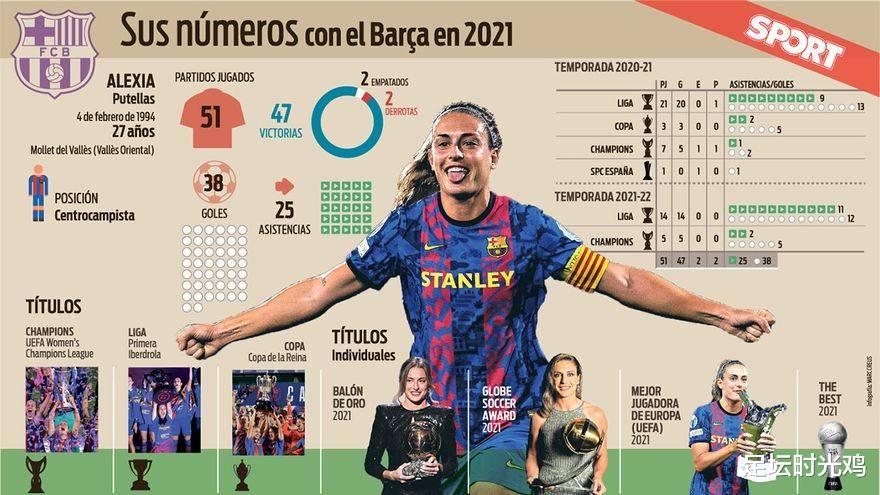 自去年11月份赢得金球奖之后,巴萨女足队长阿莱克西娅-普特利亚斯再一次地登上了欧洲各大体育报纸的头版头条,1月17日晚上7点钟在苏黎世国际足联总部举行的FIFA年度颁奖典礼上,阿莱克西娅毫无悬念当选了FIFA年度球员(女),她在球场上的领导力以及个人能力都伴随着去年完美的数据,让她登上了世界足坛的巅峰。