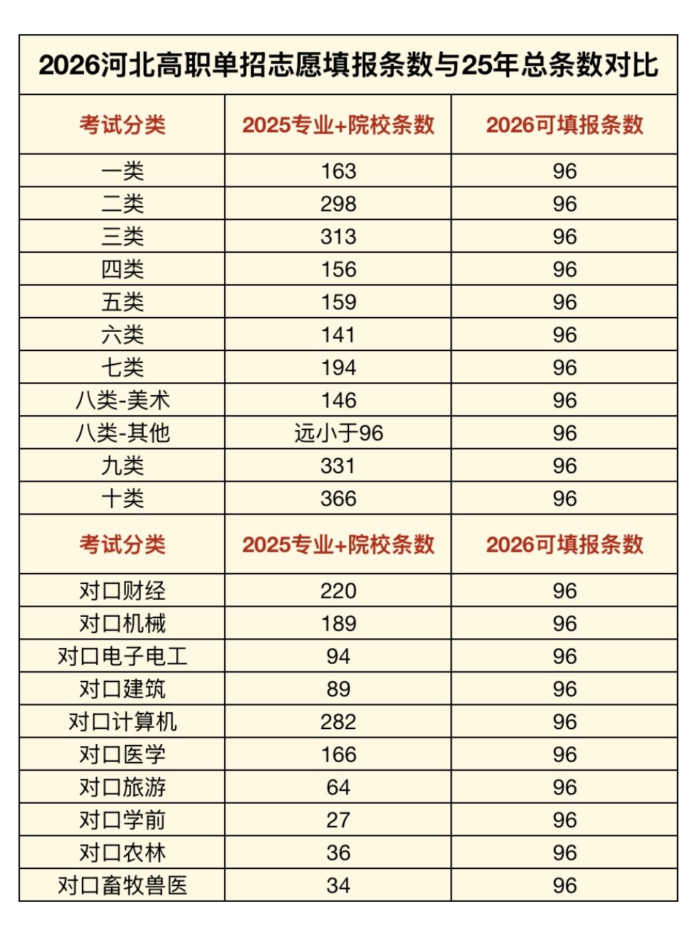 2026年:以1校1专业为志愿单位,无专业选择数量限制,最多填96个,取消调剂