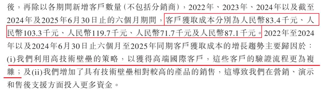 2022年至2024年,公司客户获取成本分别为8.34万元、10.33万元及11.97万元,一路走高。今年上半年,其客户获取成本为8.71万元,同比增长21%。