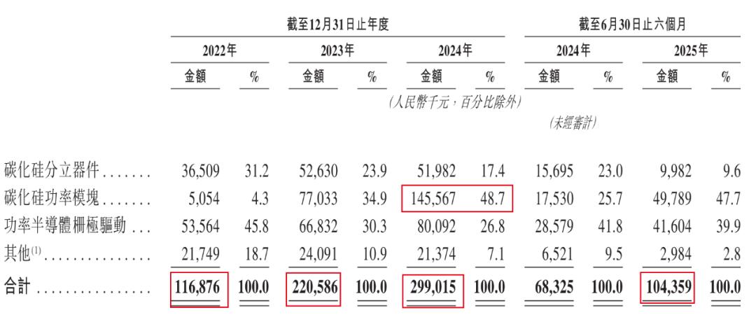 2022年至2025年上半年(以下简称:报告期),基本半导体的收入分别为1.17亿元、2.21亿元、2.99亿元及1.04亿元。以收入占比最高的碳化硅功率模块(2024年收入)计,公司在中国的市占率仅有2.9%。
