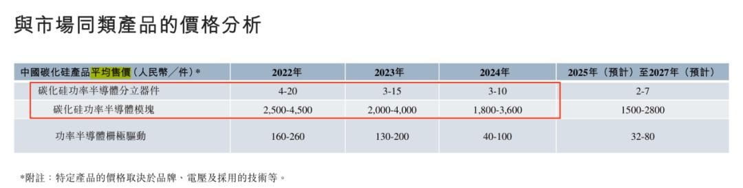 报告期内,碳化硅分立器件的平均售价从4.5元/个,下滑至3.7元/个;碳化硅功率模块的平均售价从9871.2元/个,降至1821元/个,基本贴近行业平均价格下限。