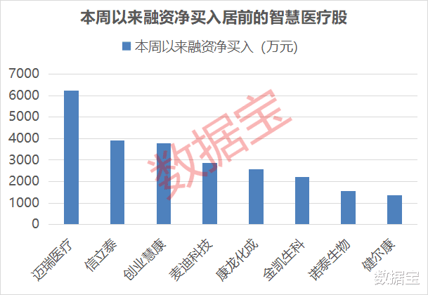 据证券时报·数据宝统计,A股中布局智慧医疗的概念股共有75只,本周以来24股获得杠杆资金加仓,8股融资净买入在1000万元以上,其中迈瑞医疗、信立泰、创业慧康分别获融资净买入6237.69万元、3909.42万元、3784.9万元。