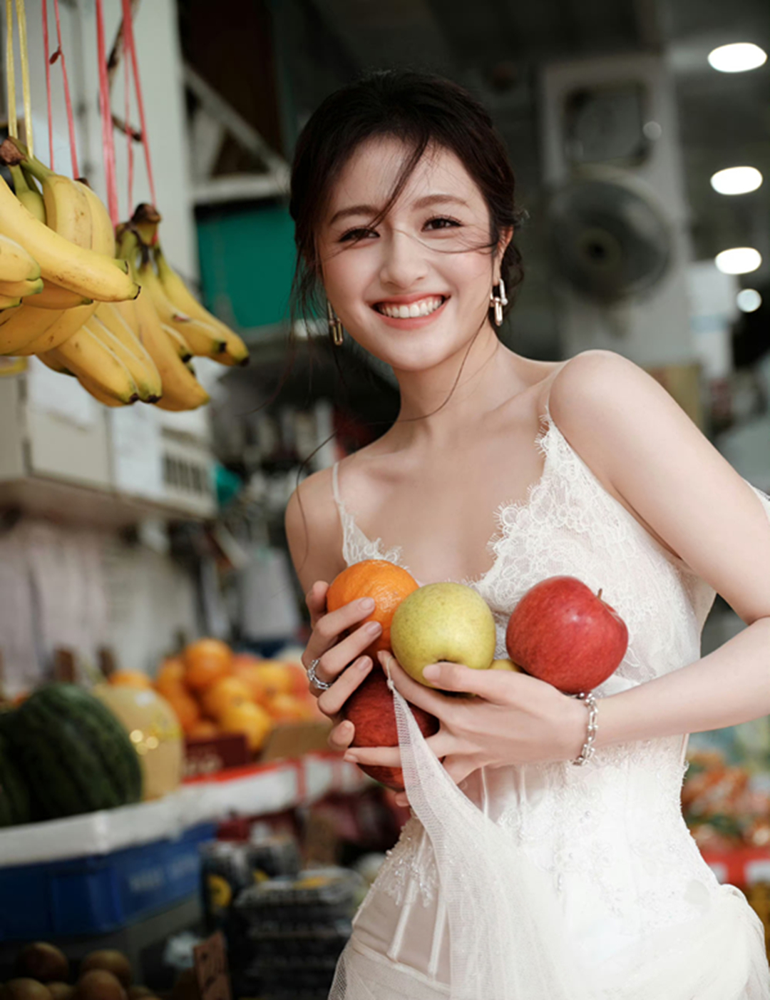 事件发生在12月初,李兰迪在社交平台分享了一组日常随拍,没有团队精心策划,也没有后期过度精修,背景是一处水果摊,道具就是一篮刚采购的应季水果。照片中,她穿着简单的白色礼服,长发随意挽起,手里捧着饱满的苹果,另一张里,提着一串葡萄挡在眼前,阳光透过果皮形成柔和光斑,脸颊的绒毛和眼角的笑纹清晰可见。