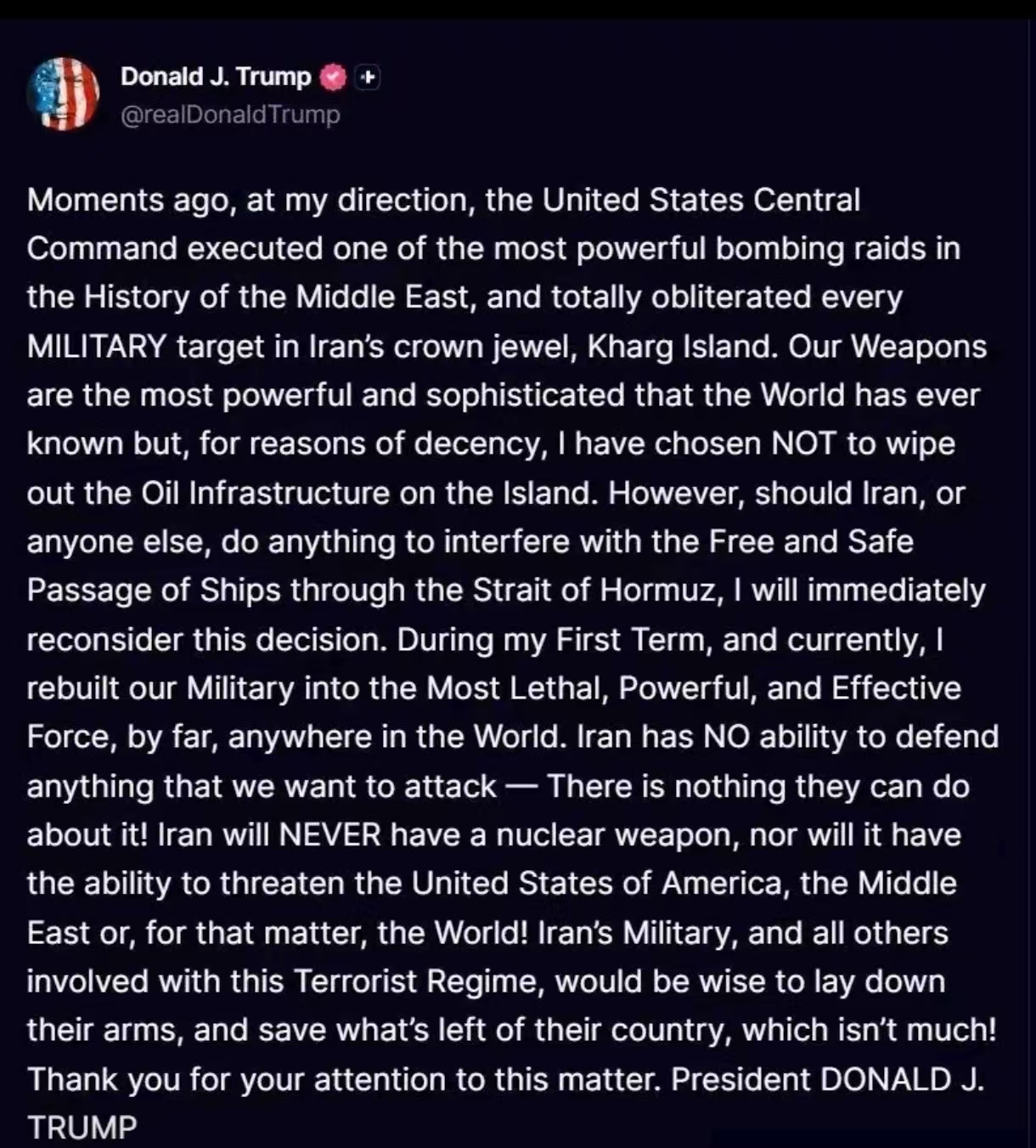 一是特朗普指示美军袭击哈尔克岛;二是只打了岛上的军事设施,没有摧毁石油基础设施;三是要求伊朗不再干扰船只安全通过霍尔木兹海峡,否则升级战事。