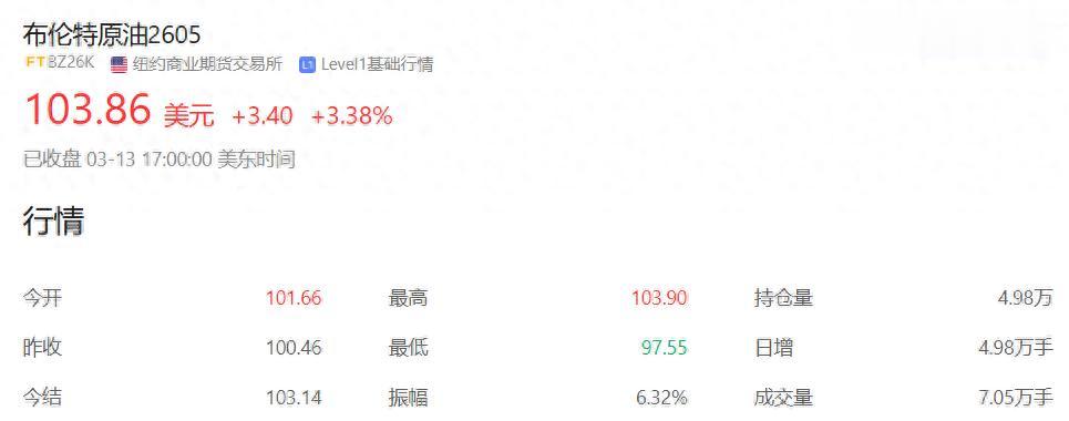 中东局势再次升级!美军在3月13日晚袭击了位于波斯湾的哈尔克岛,伊朗仅存的经济命脉受到重大威胁,国际原油价格因此大涨,布伦特原油期货上涨3.4%,再次突破100美元大关,收于103.86美元/桶。