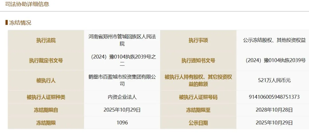 据国家企业信用信息公示系统显示,百盈城投集团所持河南垂天科技有限公司521万元股权被司法冻结,冻结期限为2025年10月29日至2028年10月28日,执行法院为河南省郑州市管城回族区人民法院;百盈城投集团所持深兰人工智能科技(上海)股份有限公司151.082万元股权被司法冻结,冻结期限为2025年8月29日至2028年8月28日,执行法院为郑州管城回族区法院。