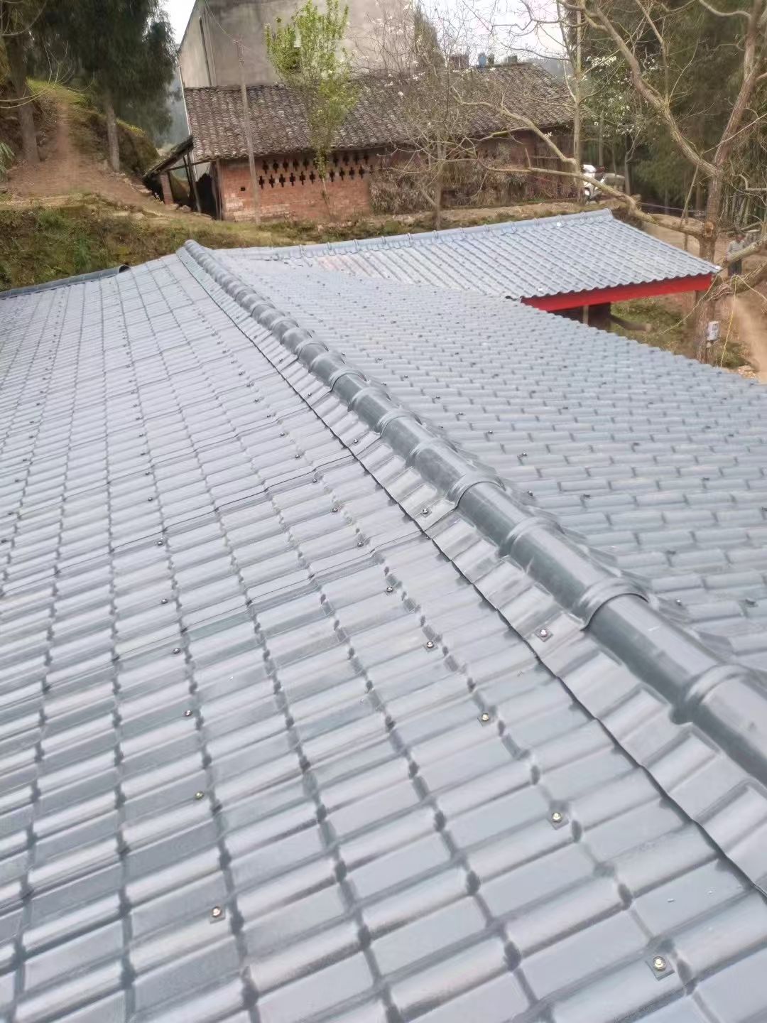 防腐耐用:树脂瓦采用高耐候性ASA树脂和PVC材料,抗腐蚀性强,长期日晒雨淋也不易老化、褪色,使用寿命可达20-30年,远超传统石棉瓦、彩钢瓦。