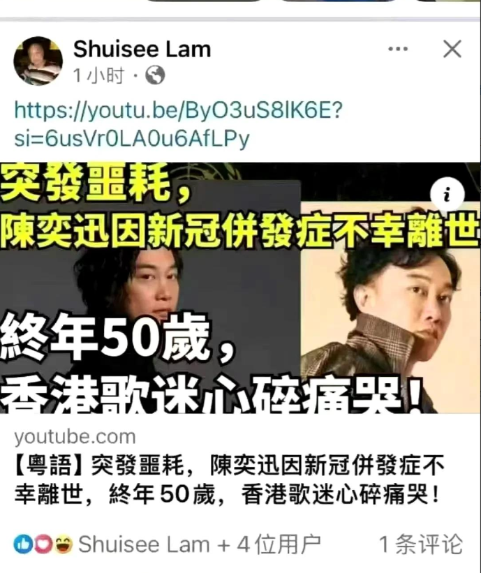 时间倒回5月15日,陈奕迅发文宣布因新冠取消筹备12年的高雄演唱会。这本是疫情后司空见惯的公告,却因某外网账号的魔改加工,变成"新冠并发症在香港猝逝"的惊悚消息。更荒诞的是,谣传中连细节都栩栩如生:"歌迷聚集红馆献花""《十年》成绝响",逼真程度让资深港乐迷都险些中招。