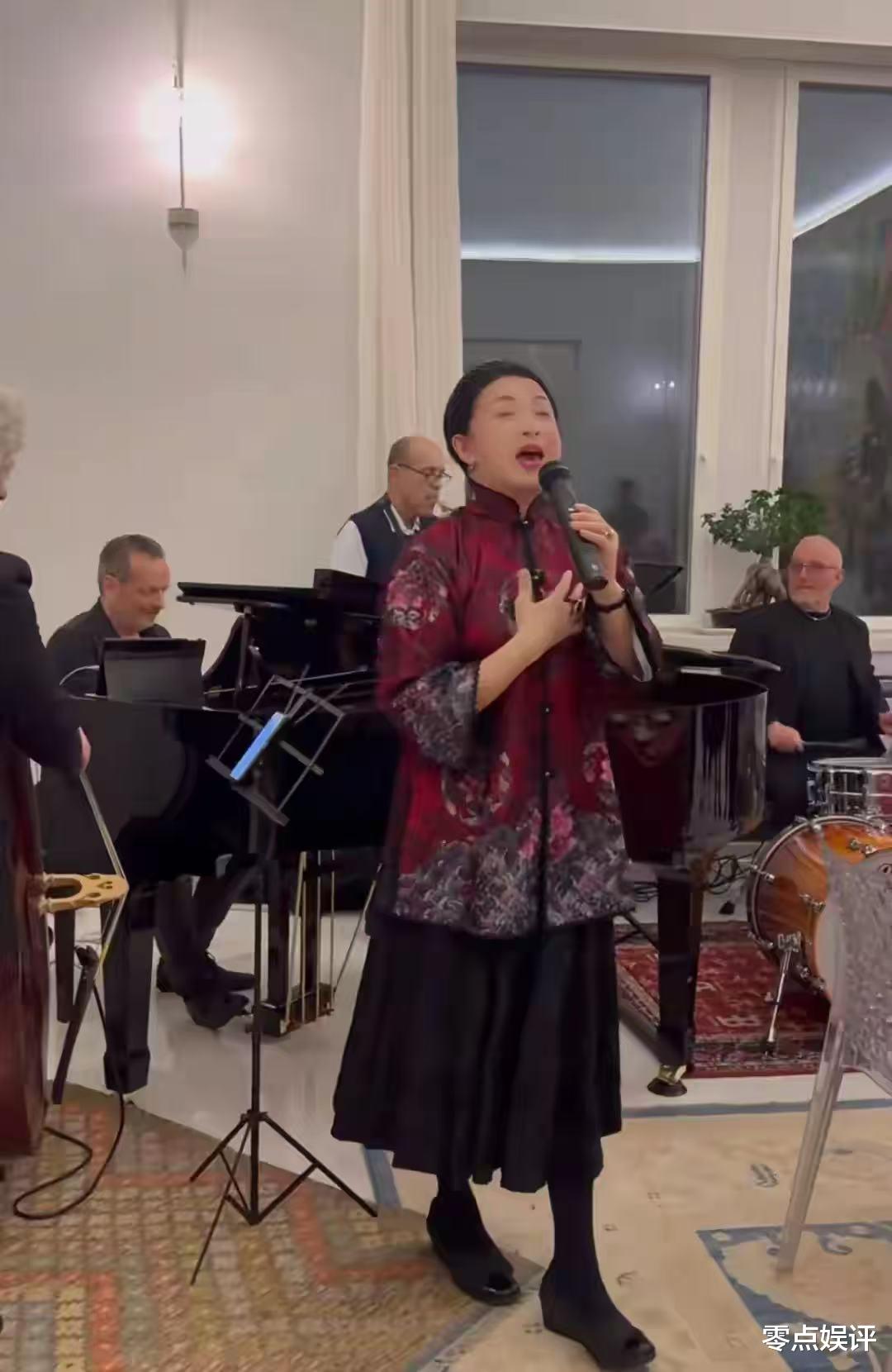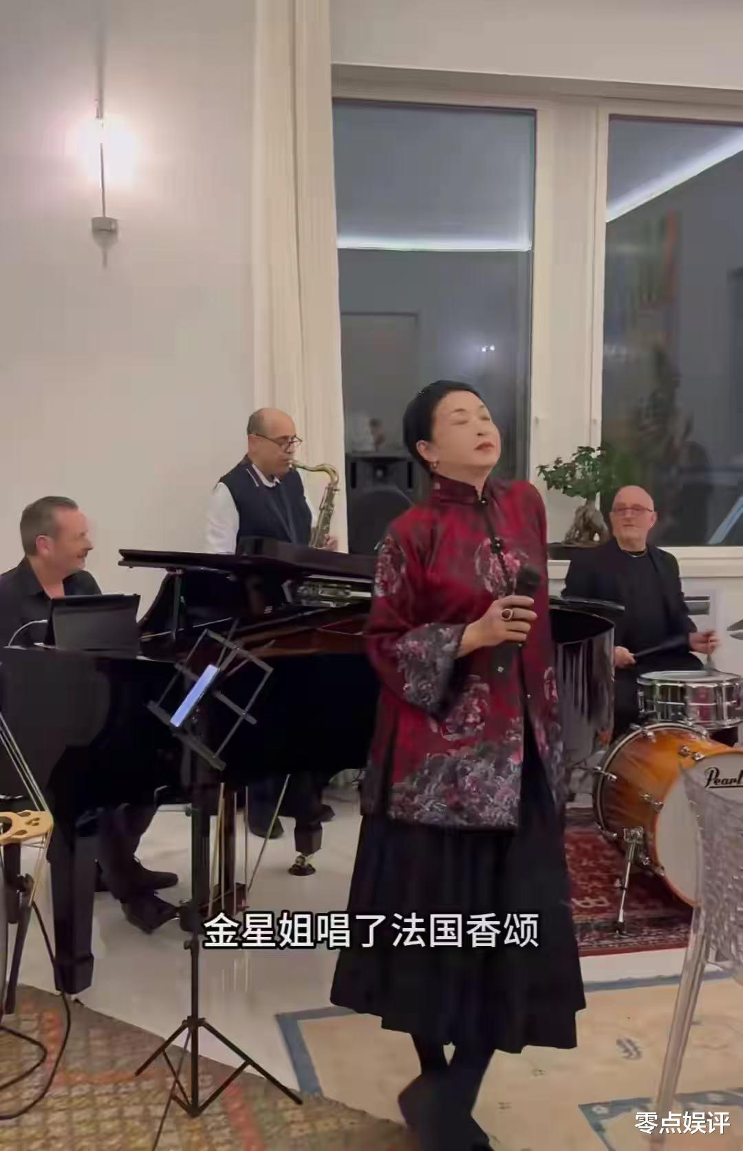 酒足饭饱后,大家围坐在一起,一边品味香槟,一边愉快聊天。不知是谁率先提议,起哄让金星高歌一曲。金星毫不推脱,立刻换上华丽 “战袍”,闪亮登场。令人惊喜的是,后面竟有一整个专业乐队为她伴奏,如此大排场,着实彰显了金星的实力与魅力。