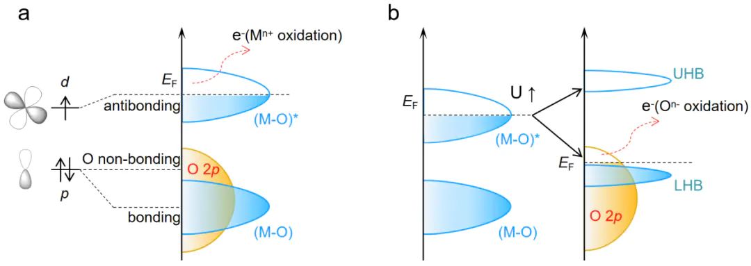 高价金属阳离子通过 d-p 轨道杂化打破相邻 M-O 键,释放晶格氧(O)并与表面M−O结合形成O−O键,同时产生氧空位(O)