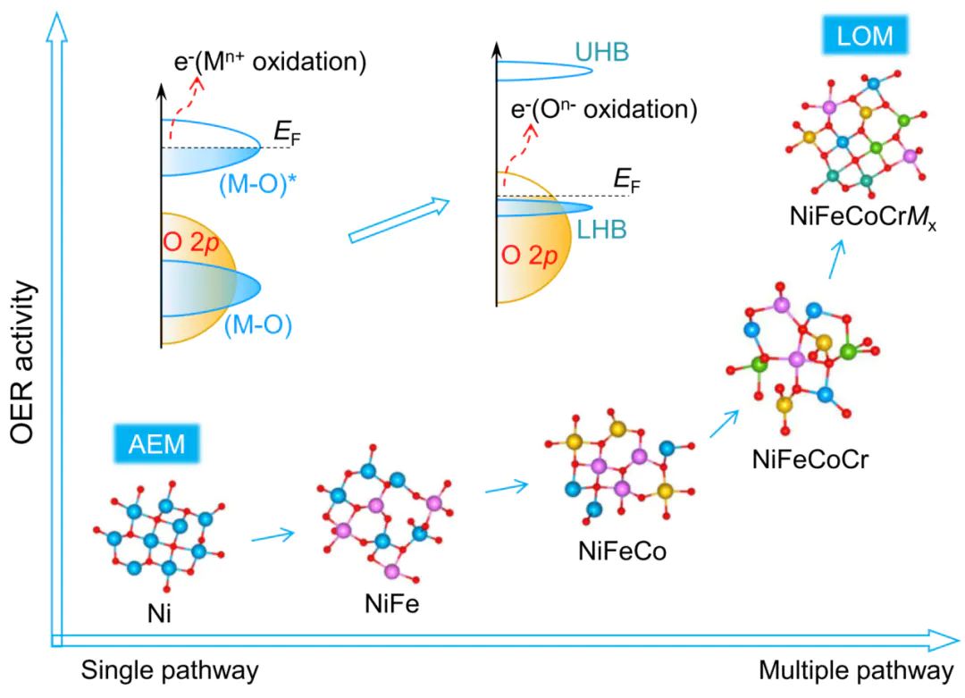 在 AEM 机制中,O∗与OOH∗的吸附能存在线性标度关系(scaling relation),无法同时优化两者吸附强度,导致过电位难以降低;而 LOM 机制中,晶格氧直接参与O−O键形成,绕开了这一限制,可将过电位降至 220 mV 以下。