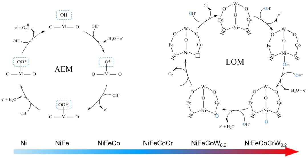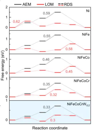 对比 AEM 与 LOM 路径的。结果显示,NiFeCoCrW的 LOM 路径 RDS(O−O键形成)自由能(0.33 eV)低于 AEM 路径(0.55 eV),证明 LOM 为优势路径。