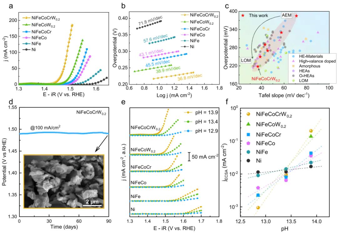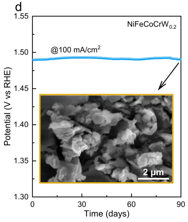 传统 AEM 催化剂易因长期吸附中间体导致活性位点堵塞,或因金属离子溶出(如 Fe³⁺、Co²⁺)而失活;而 LOM 机制中,晶格氧释放产生的氧空位具有 “自修复” 能力,空位可快速吸附电解液中的OH,同时高熵合金的化学无序性抑制金属离子过度溶出。