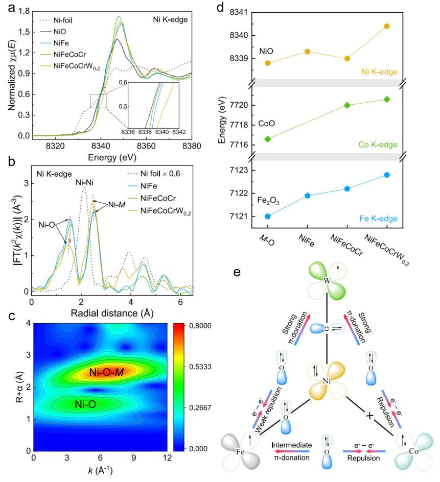 Ni K 边 XANES 显示,NiFeCoCrW的吸收边能量(8340 eV)比 NiO 标准样(8338 eV)高 2 eV,结合标准样校准,确定 Ni 的平均价态为 + 3.6(接近Ni),证明 W 的引入可显著提升 Ni 价态,增强 M-O 键的极化程度,利于晶格氧释放。