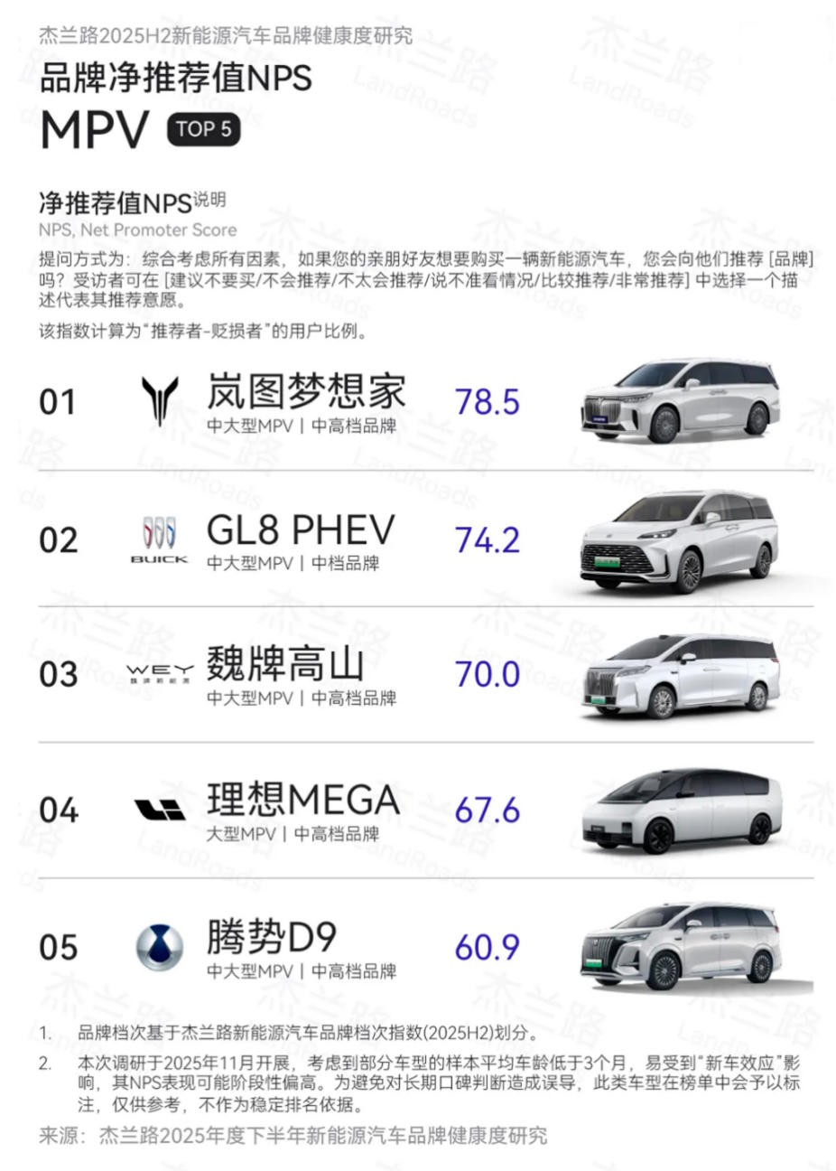 1月10日数据显示,岚图梦想家在2025年下半年销量为43191台,再次蝉联高端MPV第一,2025全年达到80248台,同比增长46%。另据杰兰路发布的《2025年度下半年新能源汽车品牌健康度研究(NPS篇)》,岚图梦想家在2025年下半年以78.5分的净推荐值(NPS)位居新能源MPV榜首。作为豪华旗舰MPV,岚图梦想家在2024年、2025年连续蝉联MPV用户净推荐值第一,成为销量与口碑的“双料冠军”,持续引领中国高端MPV。