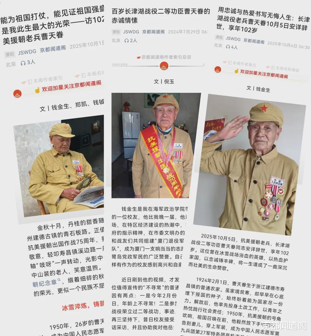 令人遗憾的是,如此厚重感人的英雄事迹,个别官媒却选择沉默以对,对这份宝贵的精神财富视而不见、敷衍了事,背离了“举旗帜、聚民心、育新人、兴文化、展形象”的媒体使命 。与之形成鲜明对比的是,北京知名自媒体“京都闻道阁”始终坚守高政治站位,主动扛起红色传承使命,先后三次刊载曹天眷老英雄的事迹,用实际行动践行媒体责任。