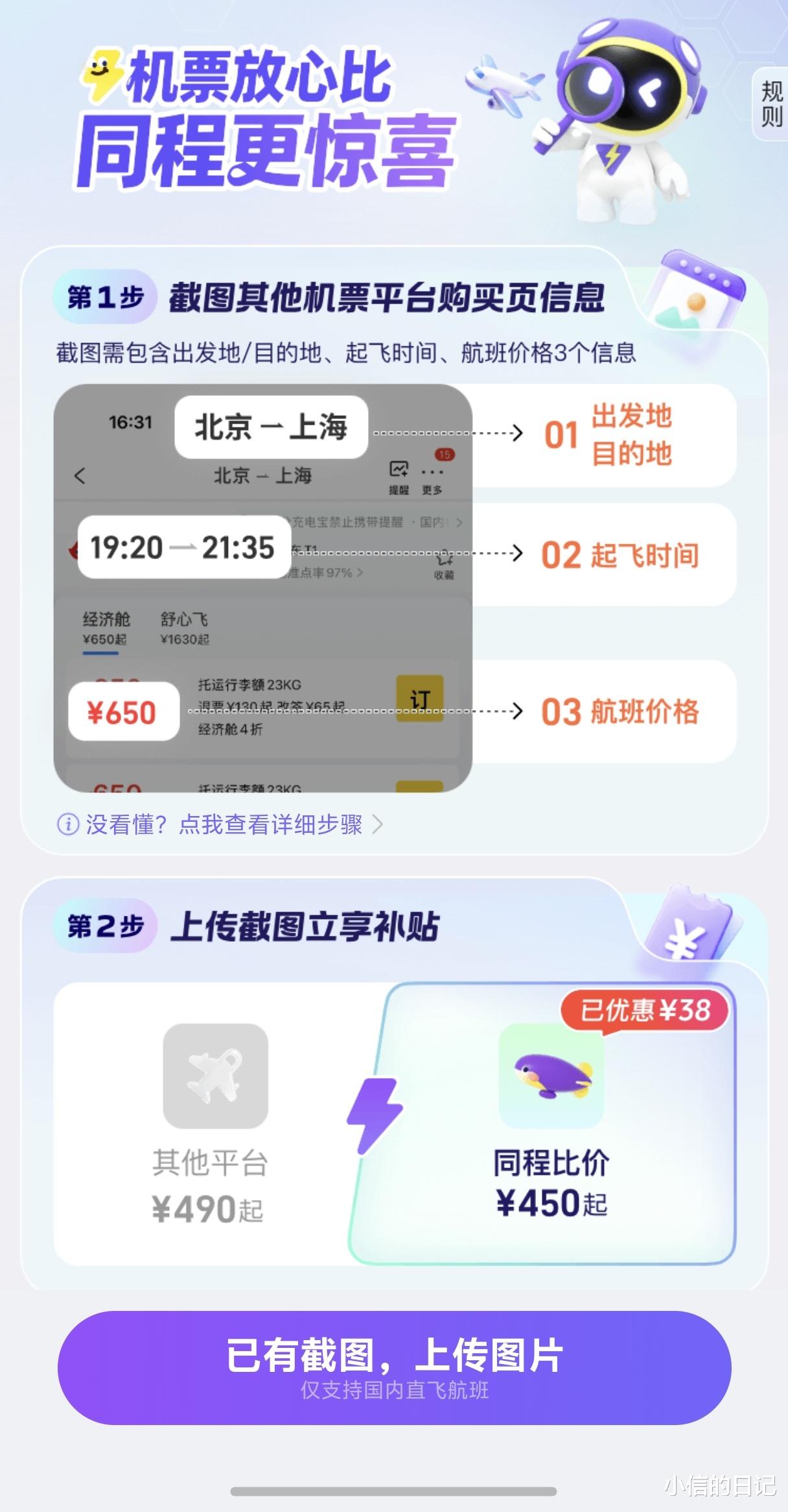 技巧2:AI比价一键找全网低价:遇到不确定的航班价格?打开同程旅行的“AI比价”功能,上传航班截图就能自动完成全网比价,还能申请差价补贴,不怕买贵。
