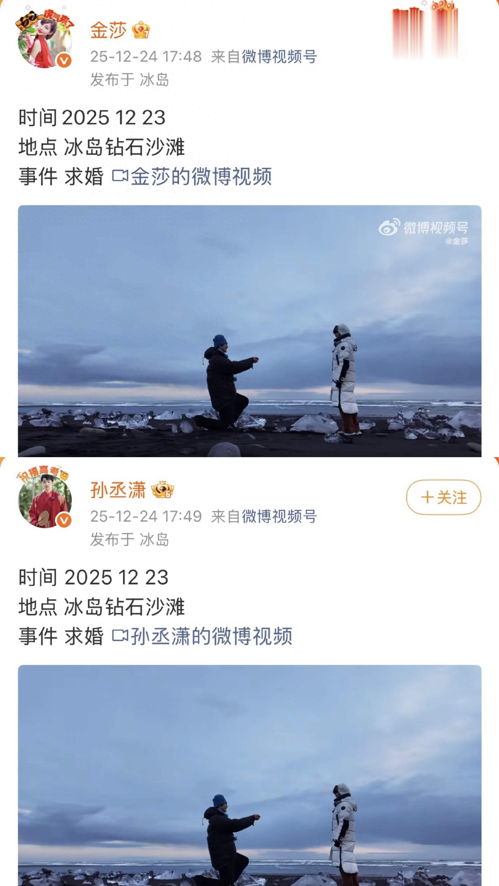 冰岛钻石沙滩的极光之下,25岁的孙丞潇单膝跪地,为42岁的金莎戴上了求婚戒指。这个被网友戏称“电影镜头都不敢这么拍”的画面,在2025年12月24日,通过金莎一句简洁的“事件:求婚”官宣,瞬间点燃了全网。三年前那段被群嘲为“母子恋”的关系,竟真的走到了童话般的章节,这让不少当初笃定这是“资源置换”的看客,手里的瓜突然不那么甜了。