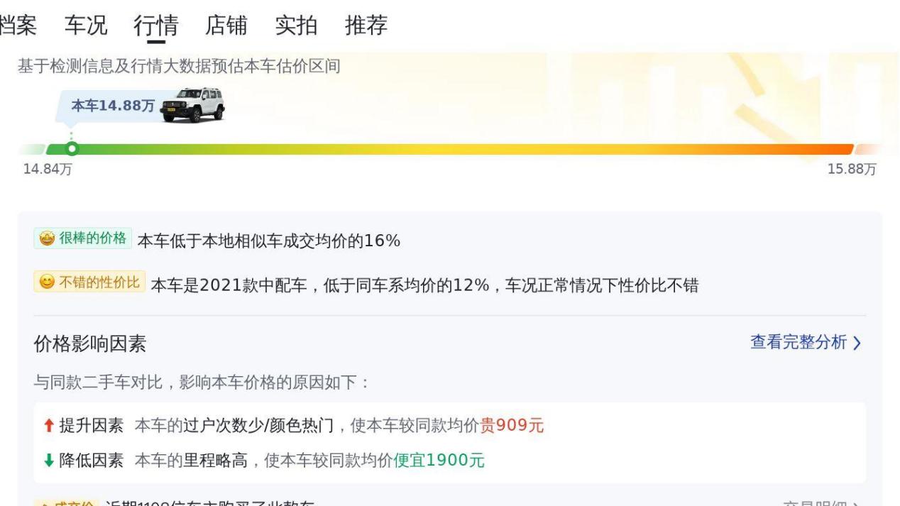 这辆坦克300征服者的报价是14.88万,相较于新车23.41万的价格,几乎是7折的优惠。虽然略高于13.17万-15.81万的市场平均价,但考虑到其良好的车况和稀有的橙色外观,这个价格依然具有竞争力。而且,坦克300的保值率一直以来都比较高,这也让它成为一项值得投资的资产。据估算,同级车的最低用车成本是12709元/年,最高是16664元/年,而这辆坦克300征服者的年用车成本约为13363元,处于中等水平,可以接受。