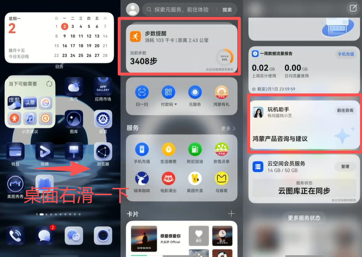 2、在顶部找到“鸿蒙产品咨询与建议”卡片(有的手机顶部是好多卡片轮播的,如果没看到这个卡片,点击一下打开卡片列表就能找到);
