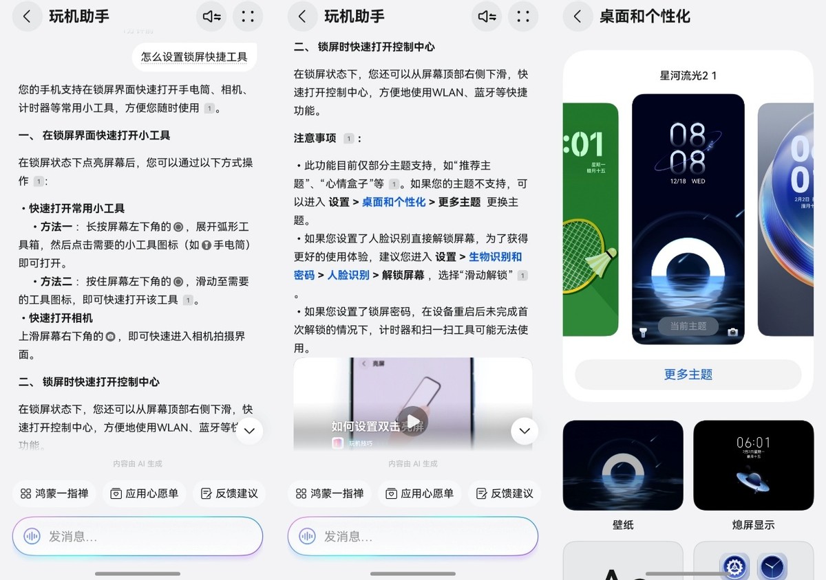 想设置锁屏快捷工具?直接语音问,玩机助手马上给出详细步骤,点击蓝色字直达设置页面,动动嘴就能搞定。