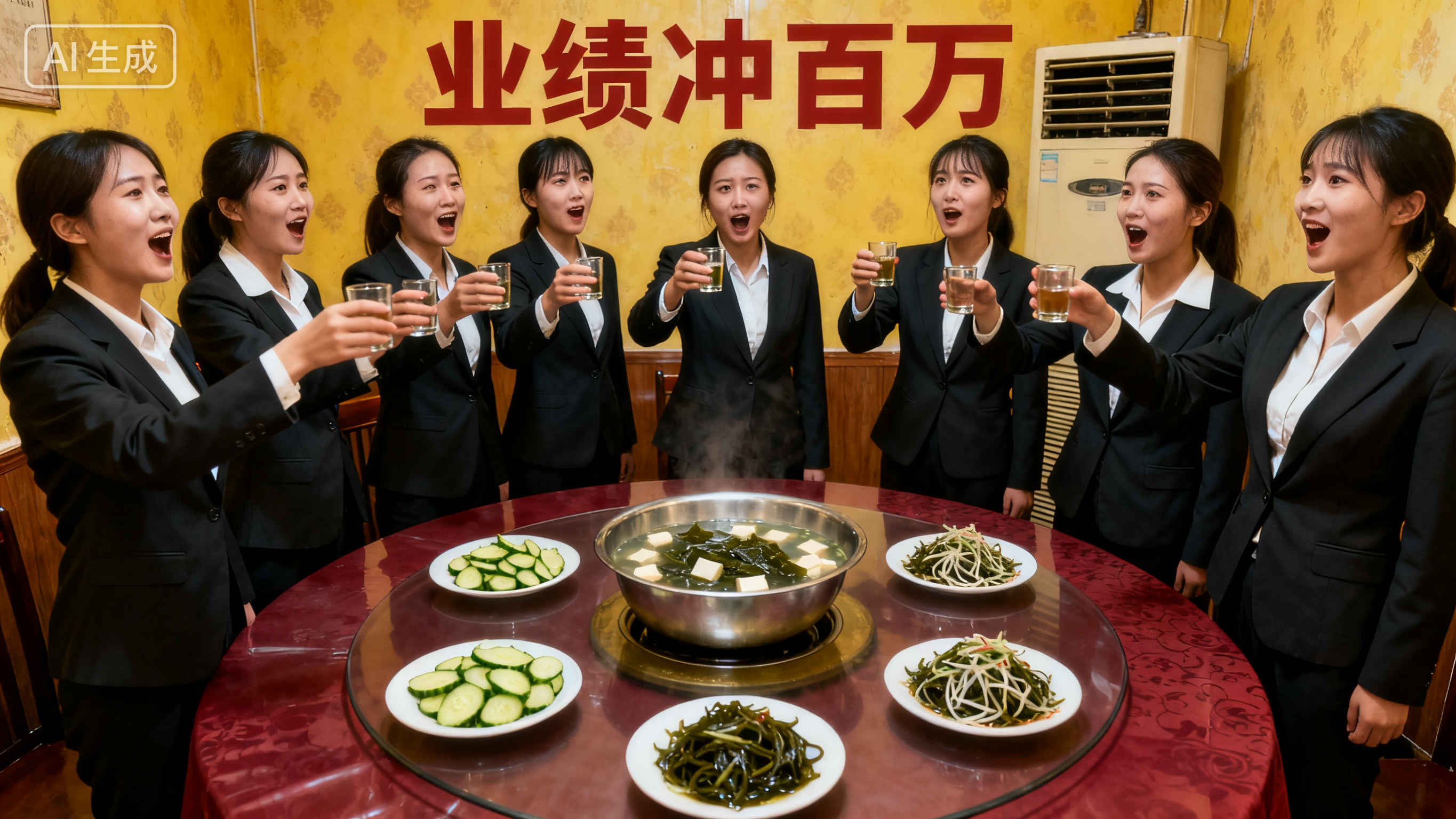 所谓的 “庆功宴”,就在一个偏僻的小饭馆,一张圆桌摆着满满当当的菜 —— 定睛一看,全是素菜!一盘凉拌海带丝、一锅豆腐汤、清炒青菜、拍黄瓜,连个肉丝都见不着!