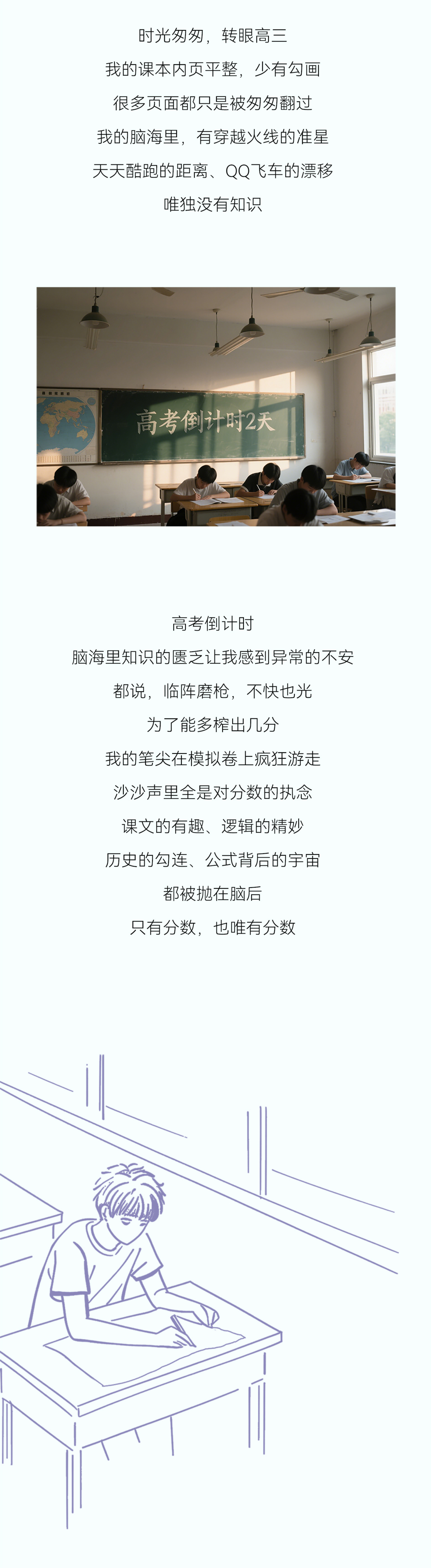 高考倒计时,脑海里知识的匮乏让我感到异常的不安。都说,临阵磨枪,不快也光。为了能多榨出几分,我的笔尖在模拟卷上疯狂游走,沙沙声里全是对分数的执念。课文的有趣、逻辑的精妙、历史的勾连、公式背后的宇宙,都被抛在脑后,只有分数,也唯有分数。
