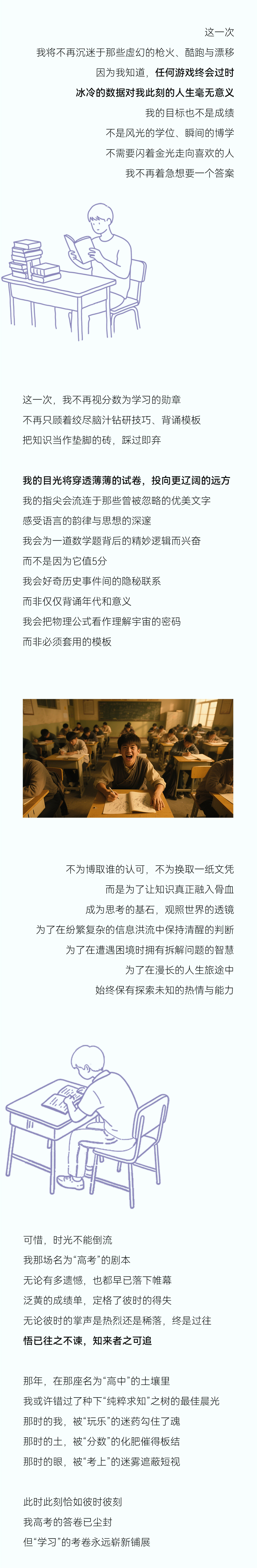 那年,在那座名为 “高中” 的土壤里,我或许错过了种下 “纯粹求知” 之树的最佳晨光。那时的我,被 “玩乐” 的迷药勾住了魂;那时的土,被 “分数” 的化肥催得板结;那时的眼,被 “考上” 的迷雾遮蔽短视。