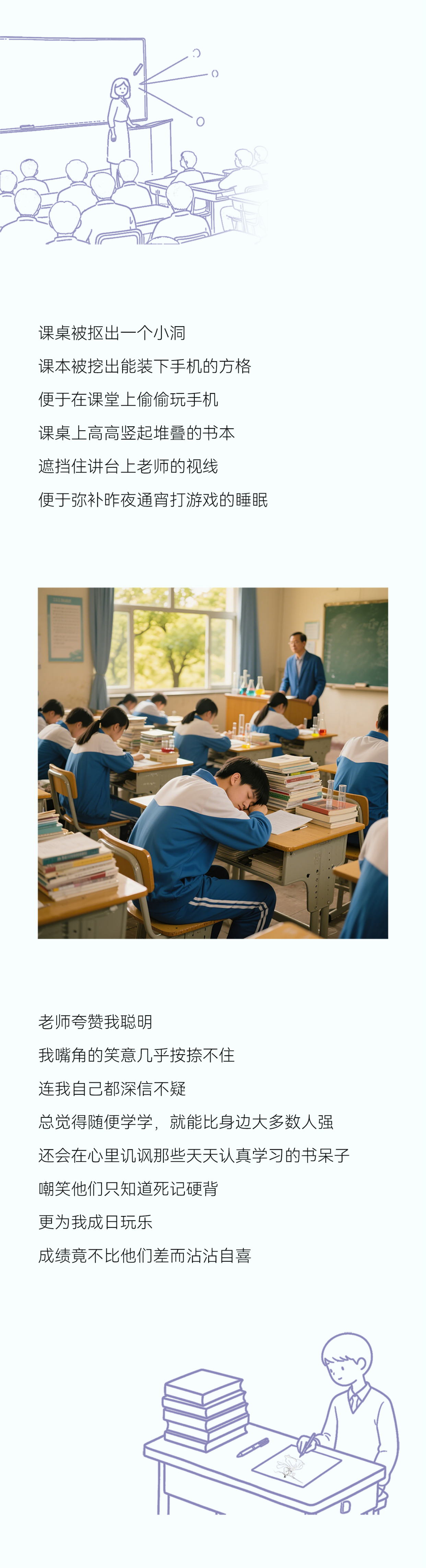 课桌被抠出一个小洞,课本被挖出能装下手机的方格,便于在课堂上偷偷玩手机;课桌上高高竖起堆叠的书本,遮挡住讲台上老师的视线,便于弥补昨夜通宵打游戏的睡眠。