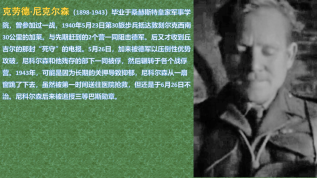 5月24日,德军抵近加莱,克劳德·尼科尔森指挥的远征军第30步兵旅奉命构筑一条临时防线,以掩护英国远征军的撤退。丘吉尔告诉尼克尔森:“大英帝国的目光都聚焦在对加莱的防御上,陛下的政府相信,你和你英勇的军团一定会做出不辜负英伦之名的壮举。”