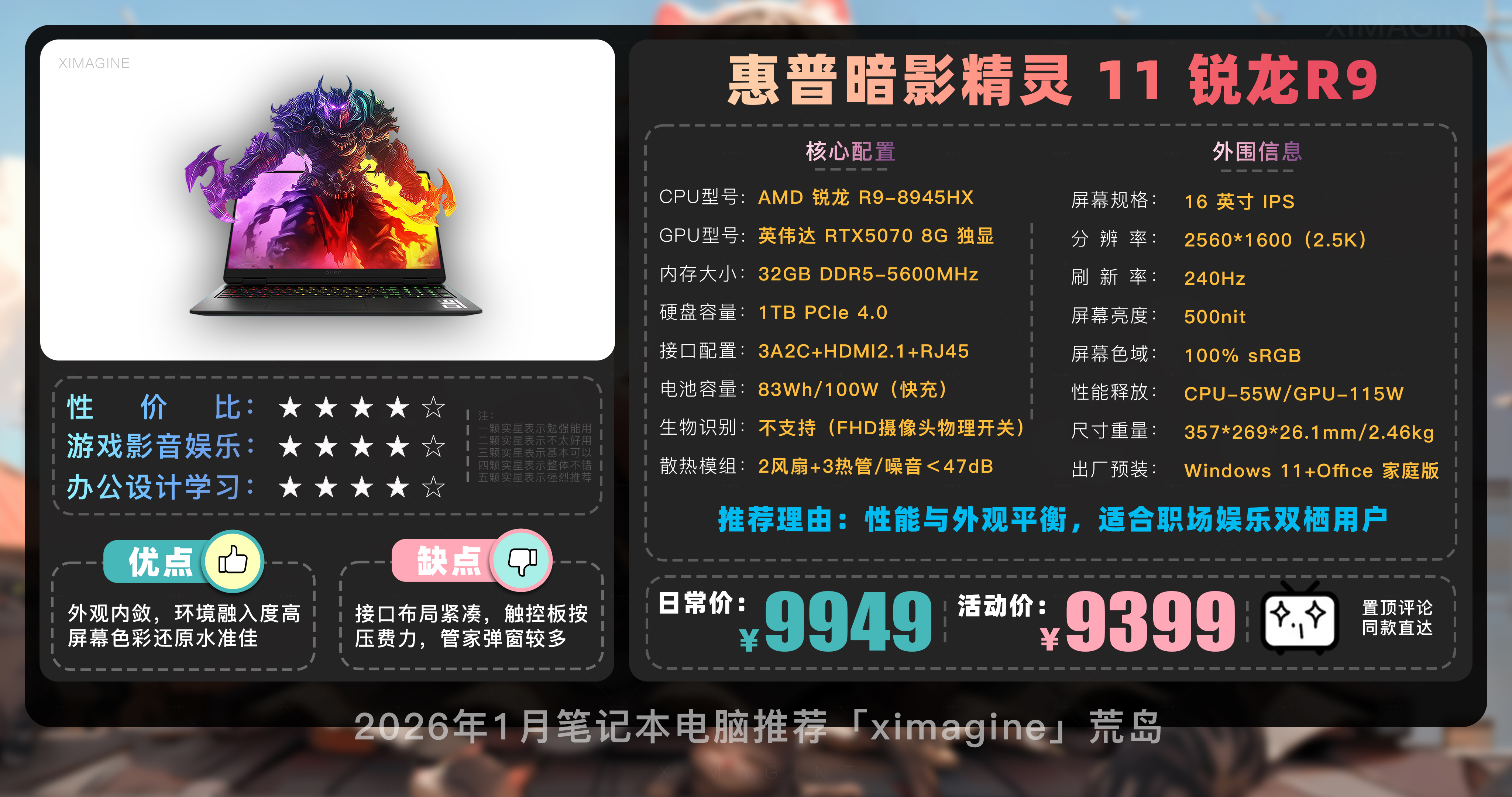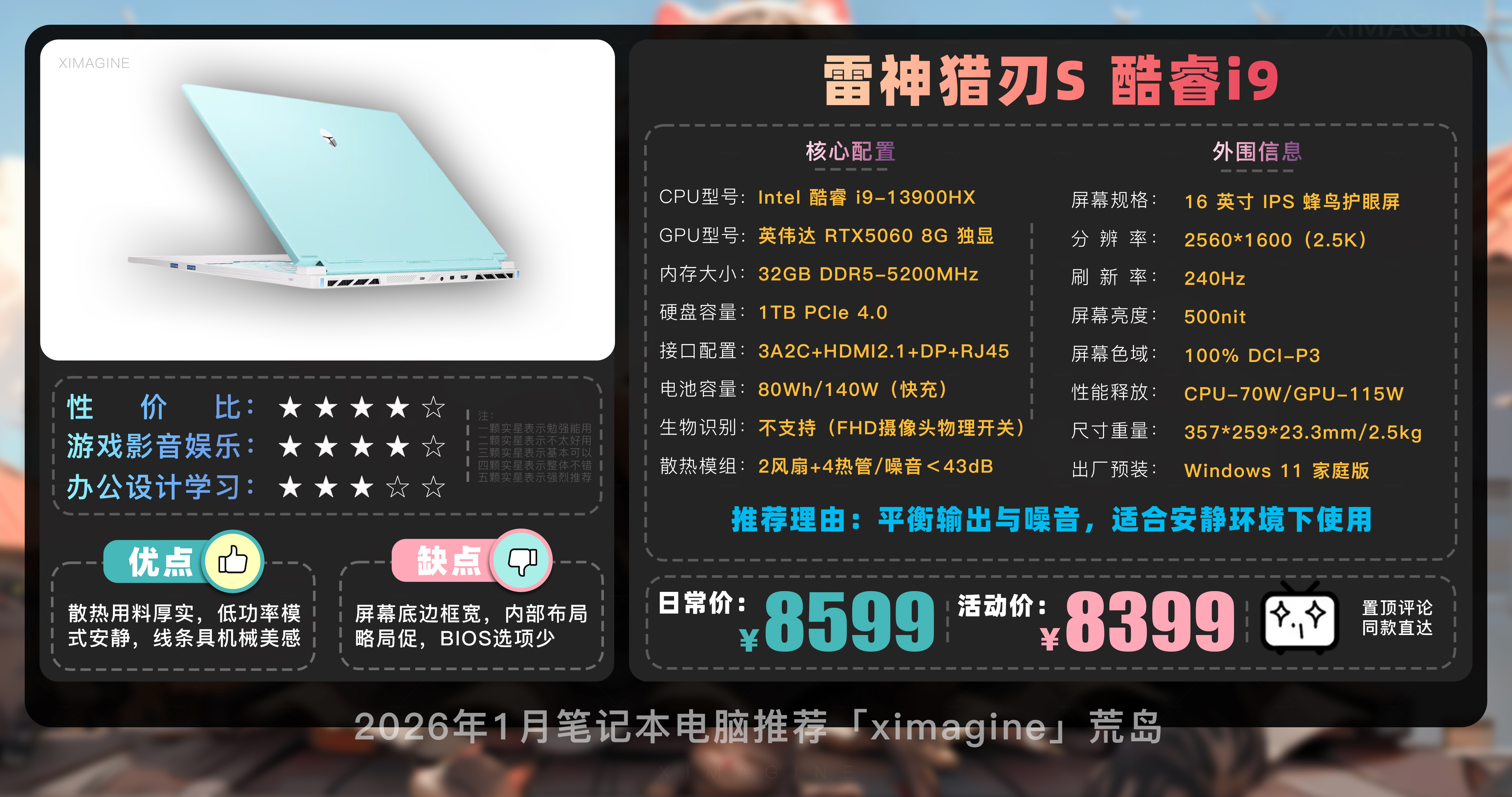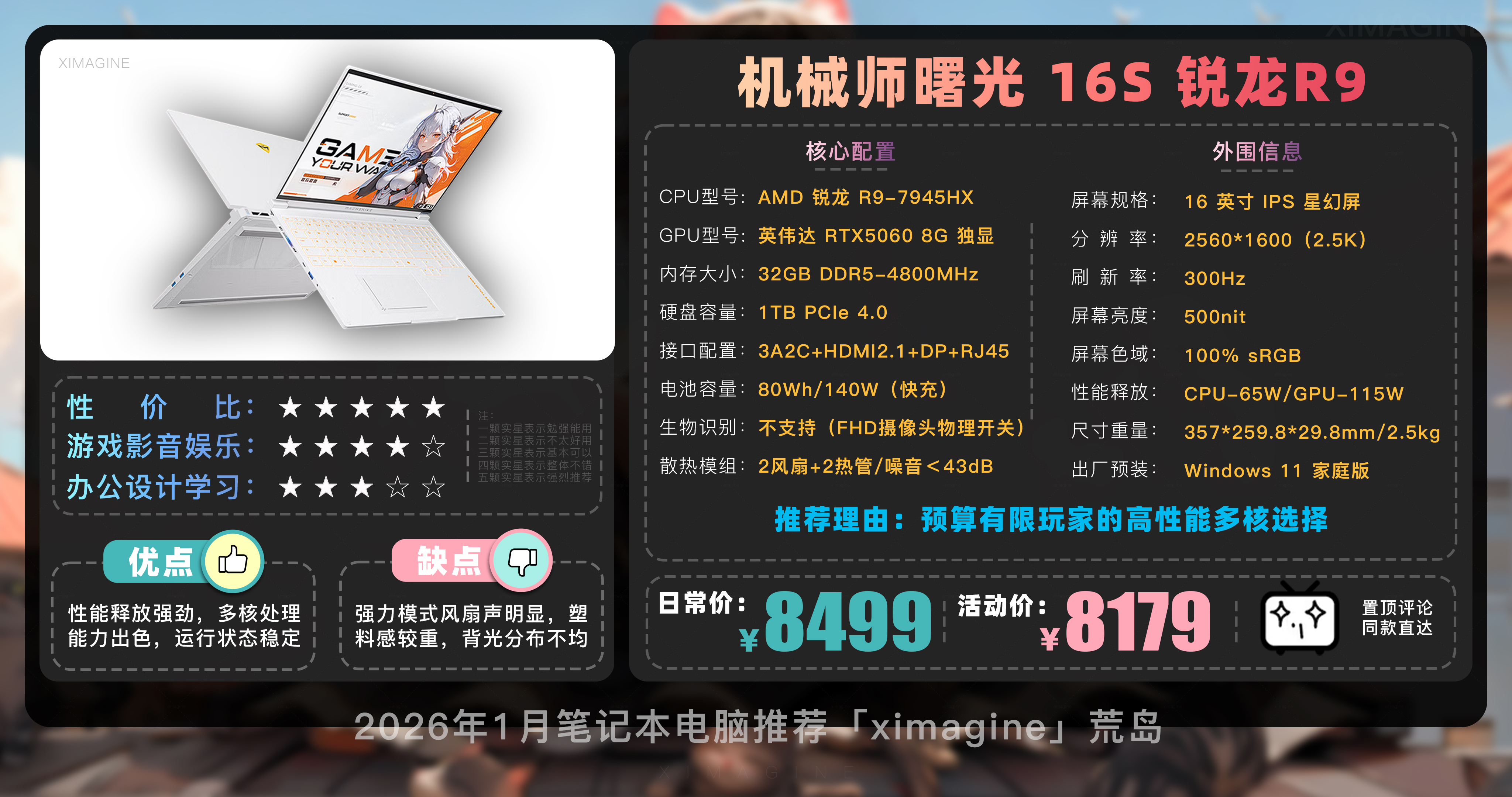 欢迎来到2026年1月笔记本电脑推荐合集!我是「ximagine」现在的笔记本市场型号多如牛毛,可处理器还是苏妈和华登五五开,苏妈的 AMD 阵营是能效比的代名词,同价位能给更多的核心数和更好的离电续航,是追求性价比首选;华登的 Intel 阵营单核爆发力强,尤其是在专业软件的稳定性上,依然有着不可替代的护城河;而苹果 M 系列拼的是制程和底层架构,让软硬件发挥出更佳性能。本期内容按照不同类型处理器分三段,每段里又分成游戏本、全能本、轻薄本三种不同定位机型。游戏本是纯粹的性能怪兽,一切为了性能释放和散热,能给出最稳的帧数,但得忍受它的厚重及噪声;轻薄本是出差党和学生的救星,不仅续航长还是优雅的办公工具;全能本则在两者之间找平衡,适合既要带去自习室,又想开黑的多面手。买游戏本要看性能释放及持续功耗,买轻薄本要看离电性能,屏幕素质是决定耐用度的关键,根据自身移动频率来决定重量上限,关注品牌线下服务网点的覆盖,话不多说,正餐开始!