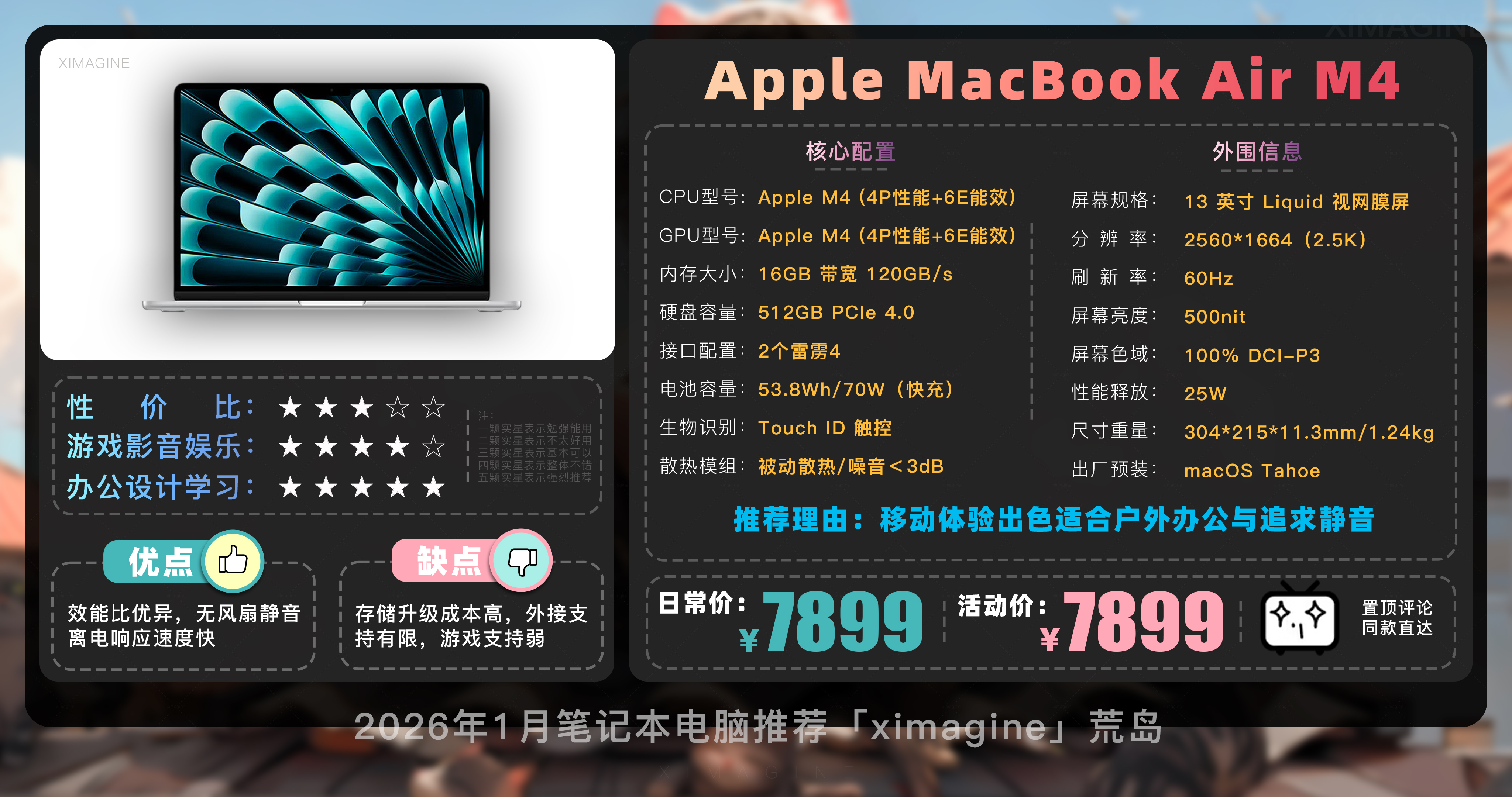 Apple MacBook Air M4 将安静与快速两个矛盾的特质结合到了新高度,无风扇设计实现了真正的物理零噪音,这在深夜创作或图书馆办公时极具幸福感,M4 芯片的超高能效比让它在不插电时依然拥有顶尖的响应速度,且 1.24kg的机身轻盈如文件夹,触控板依然是行业天花板,完全可以脱离鼠标操作。虽然它的存储升级成本依然昂贵,且对外接显示器的支持存在物理上限,但对于追求纯粹移动体验、对续航有极致要求的白领和学生来说,7899 元的它是个优雅的选择。