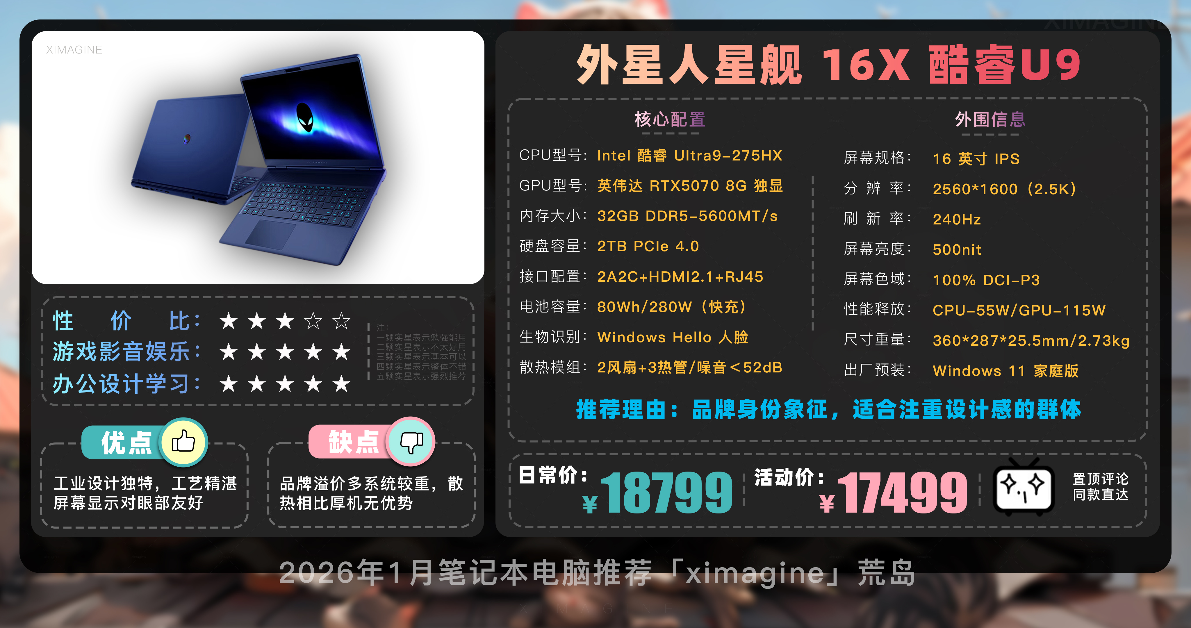 外星人星舰 16X 是工业美学的艺术品,圆润的曲线与漆面触感尽显细腻,依托酷睿 275HX 强大的主频优势,在极薄的机身内依然维持了令人惊讶的响应速度,灯控系统非常智能,能够根据游戏氛围自动变换色调。虽然为了极致的便携和设计感,它在持续高功耗下的散热表现不如传统机型稳定,且售价中包含了一定的奢侈品属性,但那种独一无二的调性和全方位上门服务的售后体系,使 17499 元的成为追求顶尖生活品质和前卫科技感的不二之选。