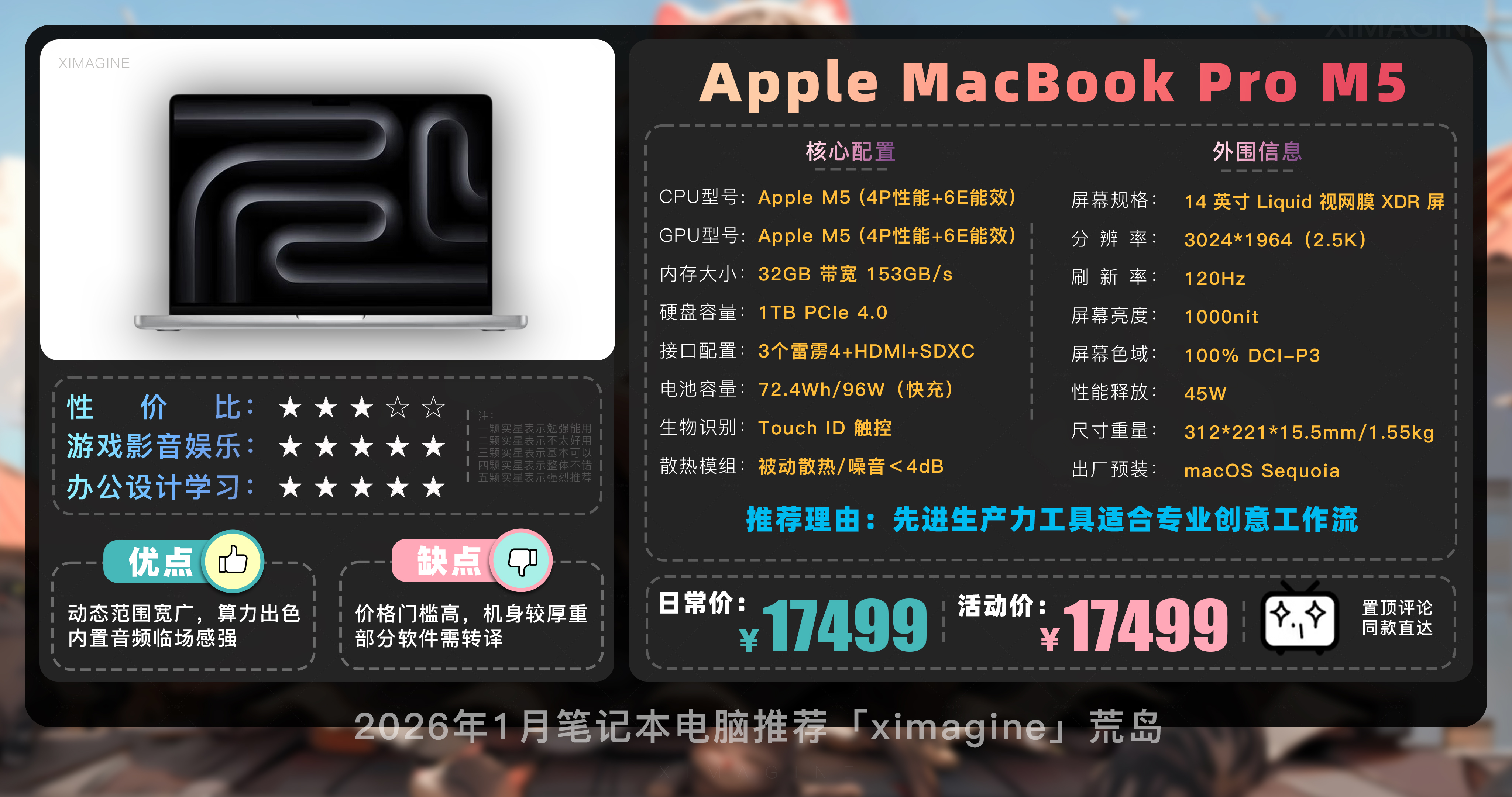 以上就是本期26年1月笔记本电脑推荐清单,如果有心水的型号,可以戳置顶评论区对应链接拿下!笔记本电脑只需选择适合自己使用场景的配置,如果预算有限追求耐用,那么 AMD 平台的性价比游戏本是挚友,如果追求稳定兼容,那么搭载 Intel 处理器的全能本能满足,如果是创意工作者,Apple M 系列能让工作变成享受。如果还在纠结,不妨在评论区留下预算和专业,以及必须要使用的软件,我会尽快回复大家,本期就到这,如果觉得内容有所帮助,请三连支持!欢迎评论区交流讨论看到后会尽快回复大家,我是「ximagine」下期再会!