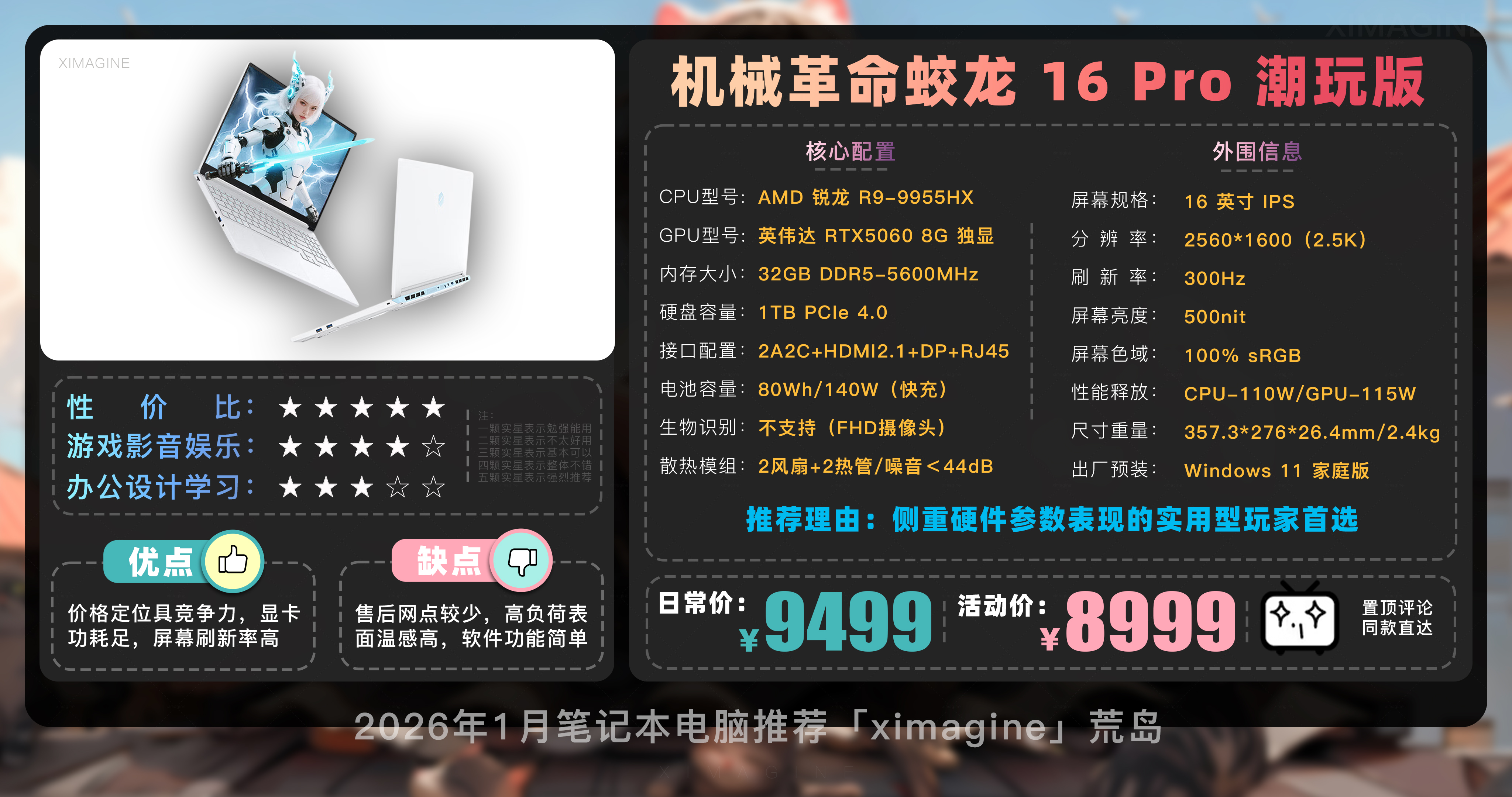 机械革命蛟龙 16 Pro 潮玩版在设计上精准捕捉了年轻玩家的审美,金属材质 A 面配合喷砂工艺,质感在同价位中非常少见,由于搭载了高能效的锐龙 9955HX 处理器,配合大面积散热鳍片,能够将 RTX5060 显卡功耗推至满血水平,这对于玩黑神话悟空等 3A 大作时能提供更稳的帧数。那块 2.5K 分辨率 300Hz 的高刷屏色彩通透,画质细腻度令人满意,虽然官方控制软件的界面设计较为朴素,且高负载下 C 面中心区域会有一定的升温感,8999 元的它凭借极高硬件规格比和双显三模切换功能,成为了实用主义玩家的热门选择。