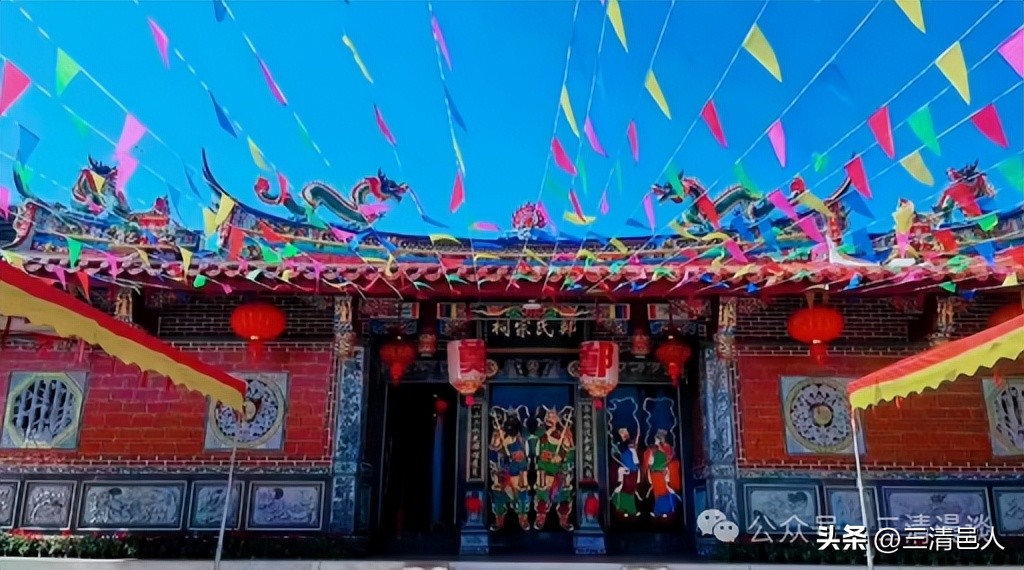 蓬莱郑氏宗祠采用经典的闽南风格,布局严谨,尽显庄重肃穆。宗祠的屋顶,红色的瓦片整齐排列,在阳光下闪烁着古朴的光泽。屋脊之上,两条色彩斑斓的琉璃巨龙腾空而起,龙身蜿蜒,鳞片细致入微,龙目炯炯有神,仿佛下一刻便要直上云霄。龙口大张,龙须飘动,尽显威严与霸气。