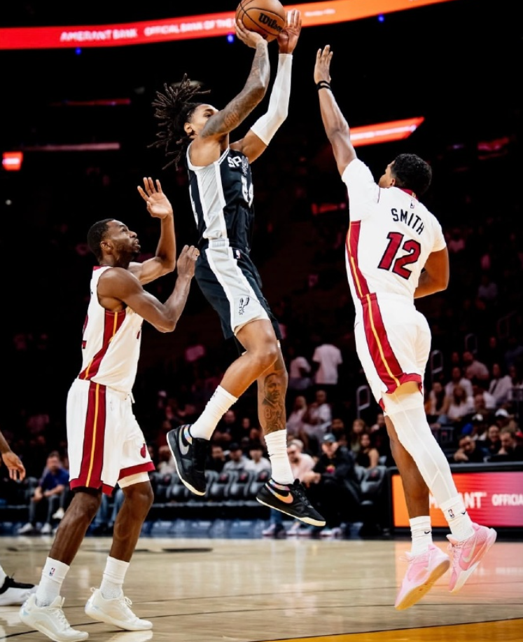 上半场结束,马刺以61-57反超热火4分,这其中全队9记三分球发挥了关键作用。