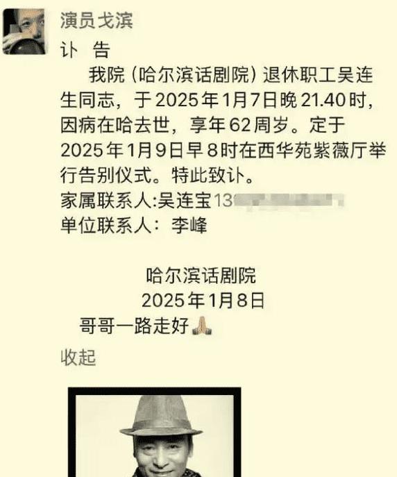 有位来自冰城的网友发了个令人心碎的消息,著名老戏骨吴连生竟然因病离世了,至于他得了啥病,网友也没说。这个消息来得太猝不及防,让圈子里的朋友和粉丝们都目瞪口呆,简直不敢相信呀!
