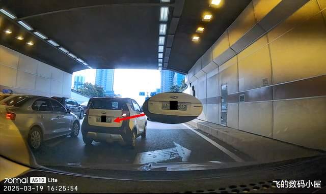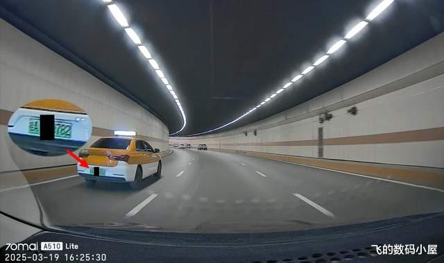 在隧道内的记录效果,虽然受到光线的影响,画面的噪点有所增加,但处于前方的车牌号码还是清晰可辨的。