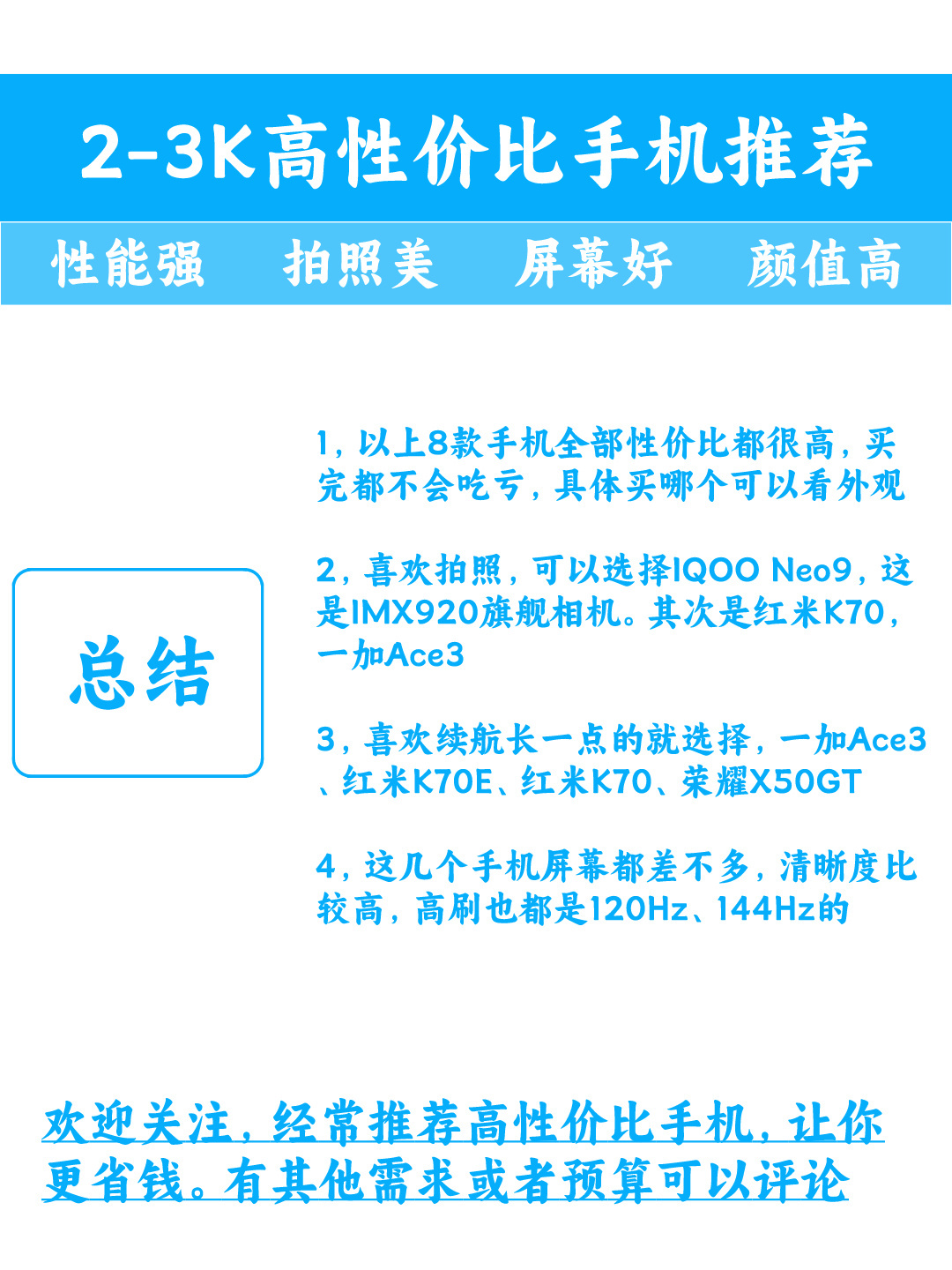 近期要买手机的进来看一下,来这里,让你买到适合的手机 关于2-3k价位预算,这里有一份详细的名单,一共8款手机 每款手机都有很高的性价比,都很值得入手。2-2.5K,一共4款,分别是:1️⃣一加Ace2,16G+256G2099 推荐理由:性能强,相机不错,支持光学防抖,预算不足首选。2️⃣iQOO Neo8,16G+512G2349 推荐理由:性能强,性价比高,追求性价比爱玩游戏的朋友可以考虑。3️⃣荣耀X50GT,16G+512G2399 推荐理由:性能强,续航长,快充一般,适合爱玩游戏追求性价比的朋友使用。4️⃣红米K70E,16G+1T2499 推荐理由:性价比很高,配置很高,相机一般,续航较强,适合玩游戏且追求性价比的男性用户。2.5K-3K价位,一共4款:1️⃣真我GTNeo5,16G+1T2599 推荐理由:性能强,配置很高,充电快,追求性价比打算长时间不换机的朋友可以考虑。2️⃣iQOO Neo9,16G+512G2799 推荐理由:拥有很高性价比,屏幕也不错,主摄相机IMX920,爱玩游戏、喜欢拍照的朋友可以考虑。3️⃣一加Ace3,16G+512G2849 性能强,续航长,拍照也不错,适合爱玩游戏追求性价比的朋友使用。4️⃣红米K70,16G+5122899 推荐理由:性价比很高,配置很高,屏幕高清,续航较强,适合玩游戏且追求性价比的男性用户。关于2-3k价位预算,就从这8款中选择吧,每一款都有性价比,买完不吃亏。有什么想问的,可以直接留言。如果有购买手机需要,可在后台私信我。