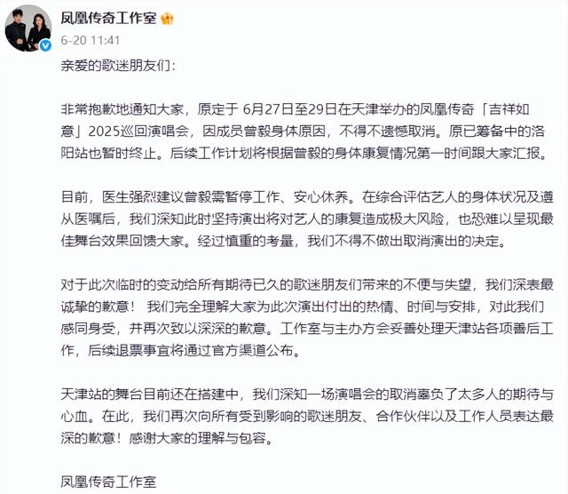 当时,他们在官方微博发文称,天津演唱会取消,洛阳站筹备同步终止,给出的理由是“曾毅身体原因”。