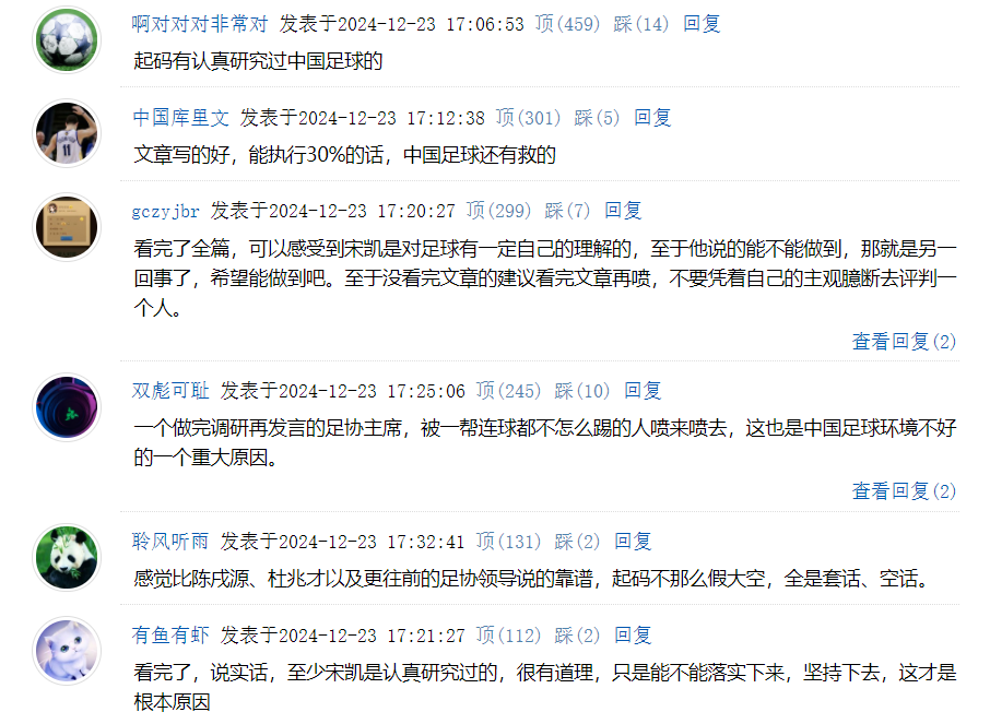 显而易见,宋凯是了解中国足球的,起码他进行了深刻的调研,不然不会说得如此贴切和到位。通篇下来,宋凯没有假大空,说得都是实际。看到宋凯的发言,大多数球迷都对他竖起了大拇指,认为他是一个干实事的人。只要他能说到做到,中国足球就有进步的空间。也有不少球迷觉得他比陈戌源强百倍!从目前的情形来看,宋凯确实比陈戌源要高,不光是认识和见地,还有眼界。
