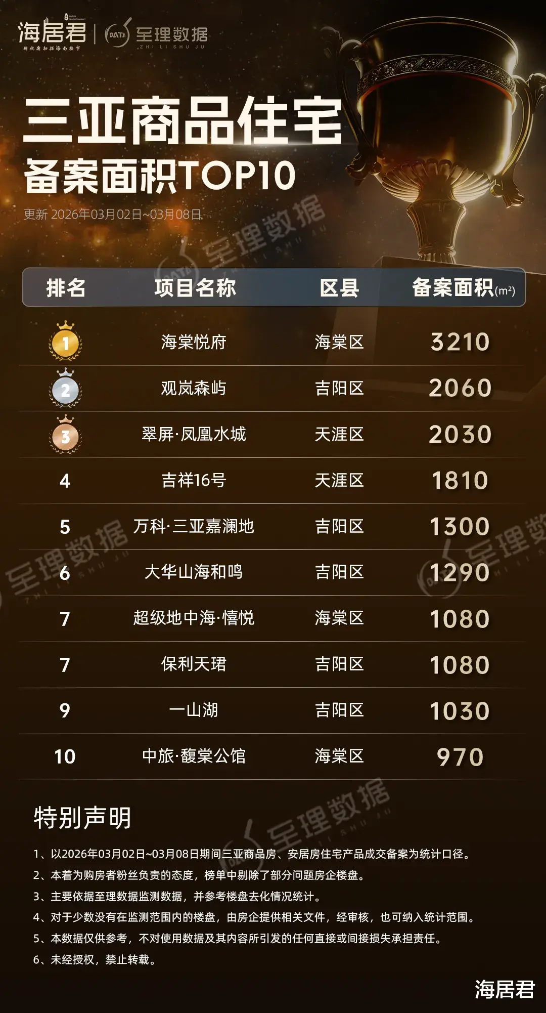 海居君旗下“至理数据”海南房地产大数据平台显示,上周(3.2-3.8)三亚商品房『住宅』成交备案163套、面积约21130平方米,揽金7.15亿元!